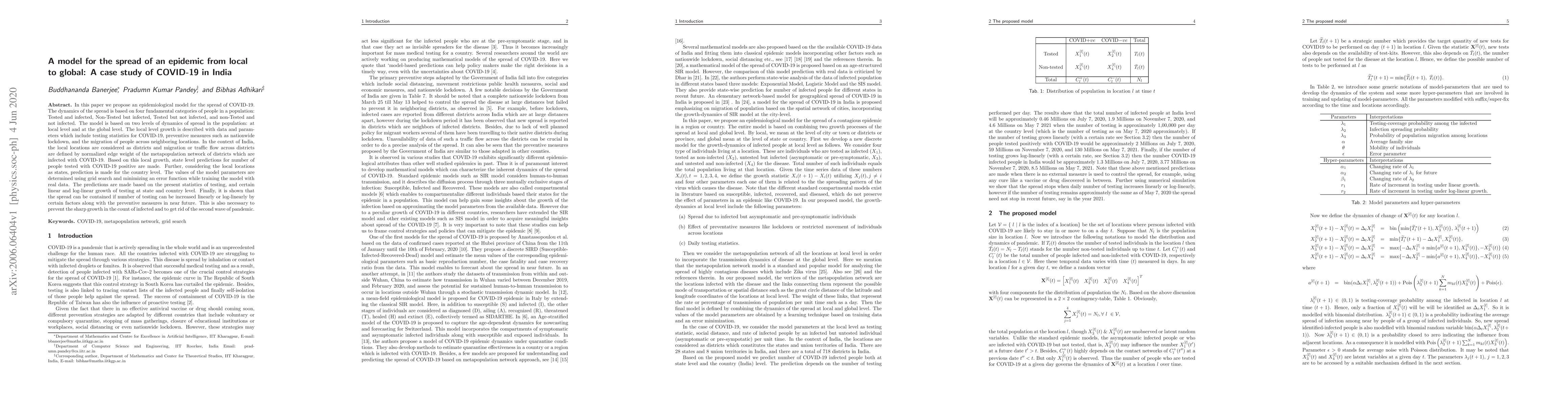 A model predicting the spread of COVID-19 from local to global levels in India is proposed, with key findings showing that increasing testing can contain the epidemic if preventive measures are implemented.