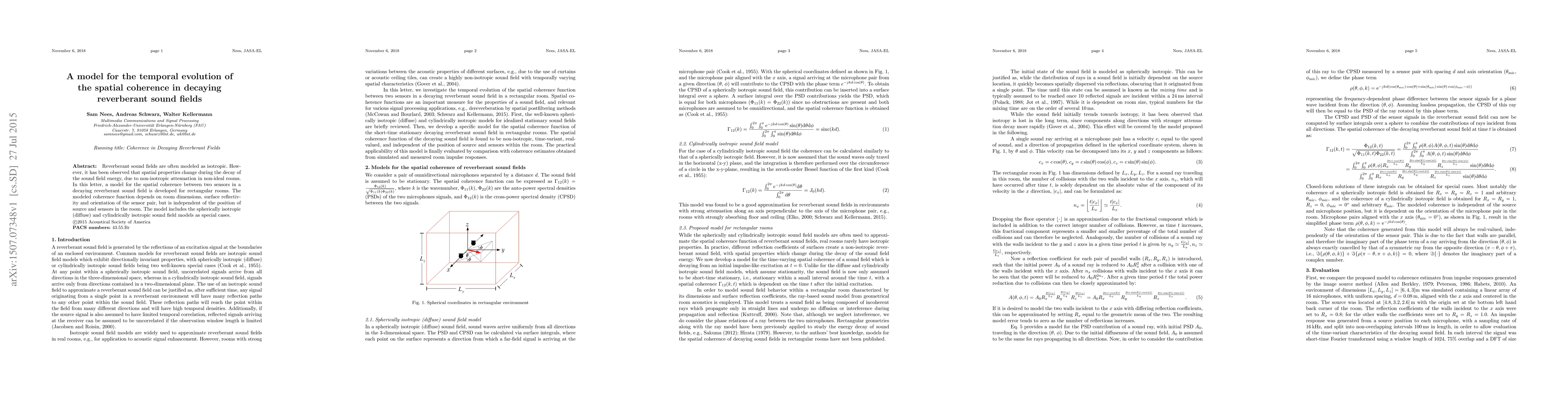 This paper develops a model for the spatial coherence evolution in decaying reverberant sound fields, focusing on rectangular rooms with non-isotropic attenuation. The model accounts for room dimensions, surface reflectivity, and sensor orientation, while being independent of source and sensor positions.