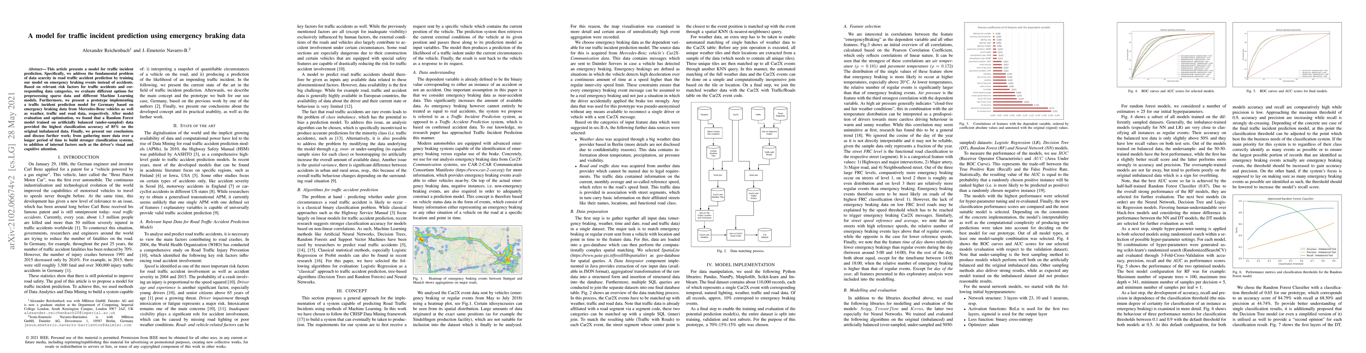 This article presents a model for traffic incident prediction. Specifically, we address the fundamental problem of data scarcity in road traffic accident prediction by training our model on emergency braking events instead of accidents. Based on relevant risk factors for traffic accidents and corresponding data categories, we evaluate different options for preprocessing sparse data and different Machine Learning models. Furthermore, we present a prototype implementing a traffic incident prediction model for Germany based on emergency braking data from Mercedes-Benz vehicles as well as weather, traffic and road data, respectively. After model evaluation and optimisation, we found that a Random Forest model trained on artificially balanced (under-sampled) data provided the highest classification accuracy of 85% on the original imbalanced data. Finally, we present our conclusions and discuss further work; from gathering more data over a longer period of time to build stronger classification systems, to addition of internal factors such as the driver's visual and cognitive attention.