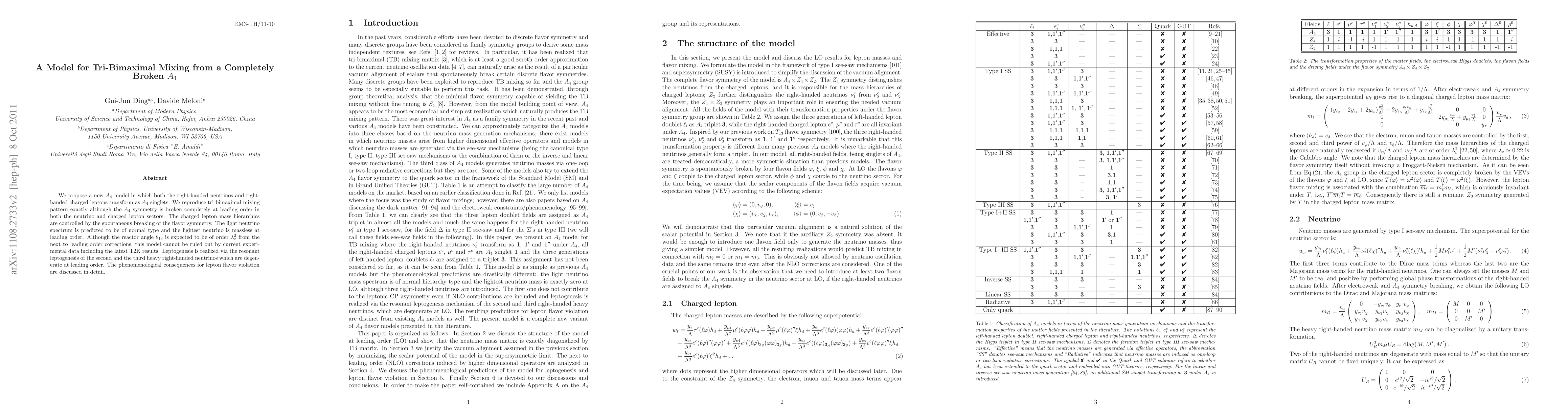 A new $A_4$ model proposes right-handed neutrinos and charged leptons as singlets, reproducing the tri-bimaximal mixing pattern despite complete breaking of $A_4$ symmetry at leading order. The model predicts a normal-type light neutrino spectrum with massless lightest neutrino.