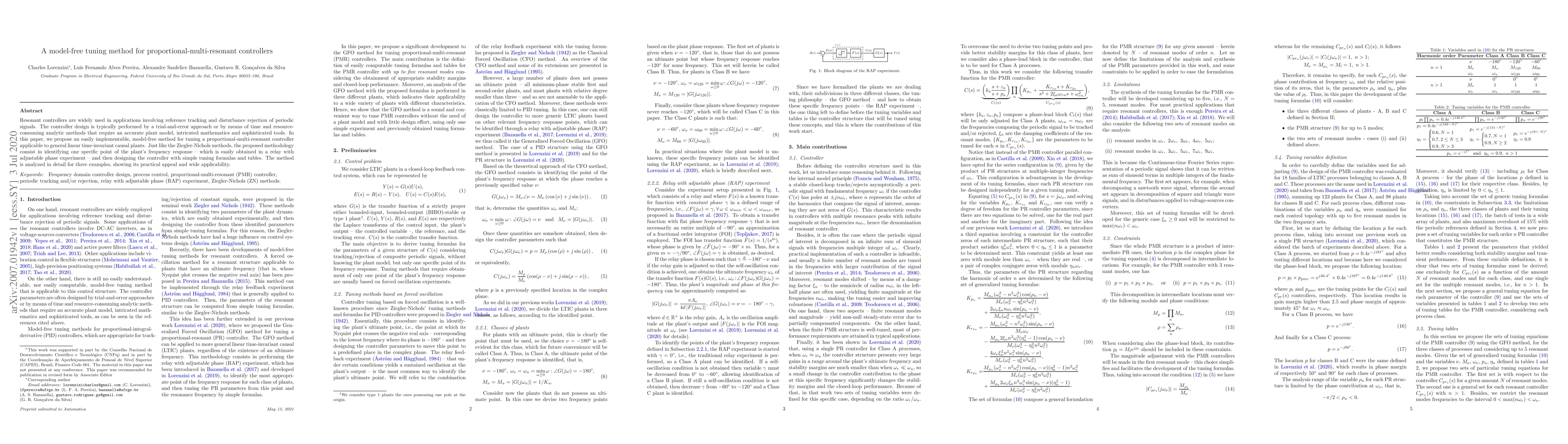 This paper proposes a model-free tuning method for proportional-multi-resonant controllers, eliminating the need for complex plant models or time-consuming analytic techniques. The method, similar to the Ziegler-Nichols approach, uses a simple frequency response identification to design controllers with straightforward tuning formulas.