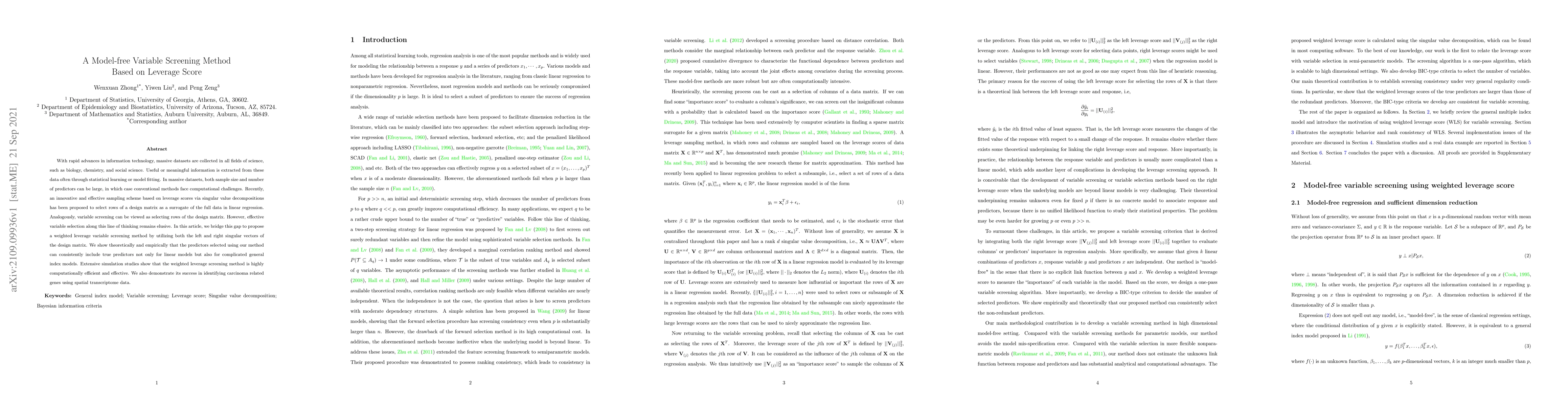 With rapid advances in information technology, massive datasets are collected in all fields of science, such as biology, chemistry, and social science. Useful or meaningful information is extracted from these data often through statistical learning or model fitting. In massive datasets, both sample size and number of predictors can be large, in which case conventional methods face computational challenges. Recently, an innovative and effective sampling scheme based on leverage scores via singular value decompositions has been proposed to select rows of a design matrix as a surrogate of the full data in linear regression. Analogously, variable screening can be viewed as selecting rows of the design matrix. However, effective variable selection along this line of thinking remains elusive. In this article, we bridge this gap to propose a weighted leverage variable screening method by utilizing both the left and right singular vectors of the design matrix. We show theoretically and empirically that the predictors selected using our method can consistently include true predictors not only for linear models but also for complicated general index models. Extensive simulation studies show that the weighted leverage screening method is highly computationally efficient and effective. We also demonstrate its success in identifying carcinoma related genes using spatial transcriptome data.