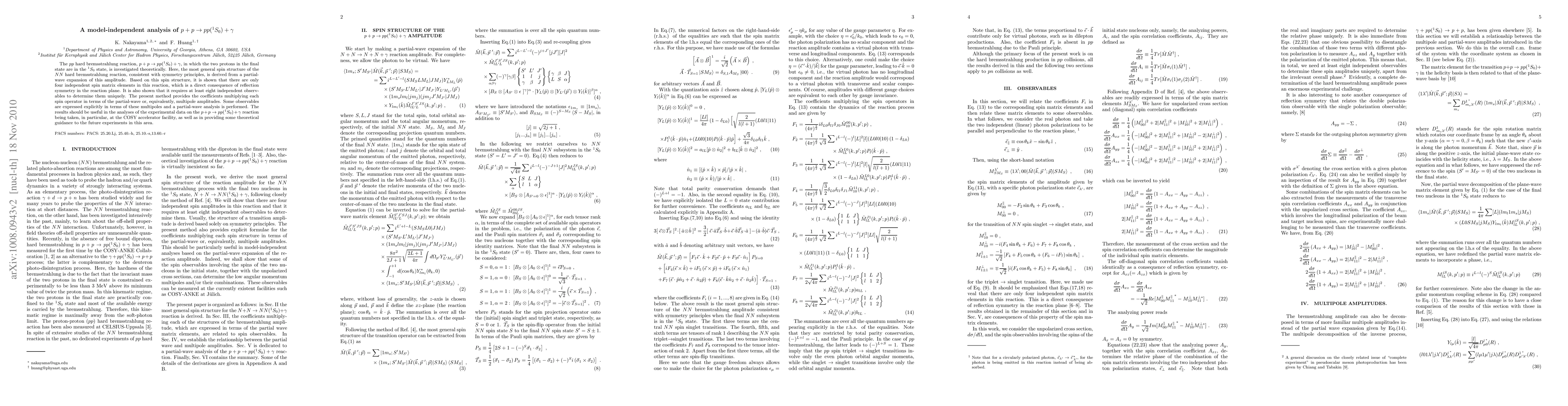 The pp hard bremsstrahlung reaction, p + p --> pp(1S0) + gamma, in which the two protons in the final state are in the 1S0 state, is investigated theoretically. Here, the most general spin structure of the NN hard bremsstrahlung reaction, consistent with symmetry principles, is derived from a partial-wave expansion of this amplitude. Based on this spin structure, it is shown that there are only four independent spin matrix elements in this reaction, which is a direct consequence of reflection symmetry in the reaction plane. It is also shown that it requires at least eight independent observables to determine them uniquely. The present method provides the coefficients multiplying each spin operator in terms of the partial-wave or, equivalently, multipole amplitudes. Some observables are expressed explicitly in terms of these multipoles and a partial-wave analysis is performed. The results should be useful in the analyses of the experimental data on the p + p --> pp(1S0) + gamma reaction being taken, in particular, at the COSY accelerator facility, as well as in providing some theoretical guidance to the future experiments in this area.