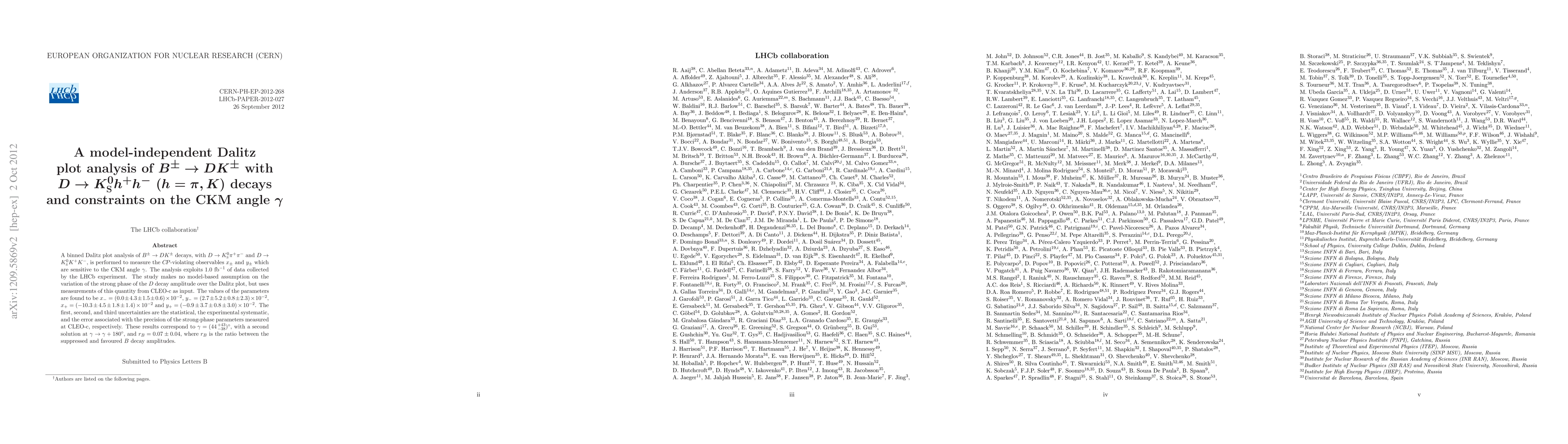 A binned Dalitz plot analysis of $B^\pm \to D K^\pm$ decays, with $D \to K^0_{\rm S} \pi^+\pi^-$ and $D \to K^0_{\rm S} K^+ K^-$, is performed to measure the CP-violating observables $x_{\pm}$ and $y_{\pm}$ which are sensitive to the CKM angle $\gamma$. The analysis exploits 1.0 $\rm fb^{-1}$ of data collected by the LHCb experiment. The study makes no model-based assumption on the variation of the strong phase of the D decay amplitude over the Dalitz plot, but uses measurements of this quantity from CLEO-c as input. The values of the parameters are found to be $x_- = (0.0 \pm 4.3 \pm 1.5 \pm 0.6) \times 10^{-2}$, $y_- = (2.7 \pm 5.2 \pm 0.8 \pm 2.3) \times 10^{-2}$, $x_+ = (-10.3 \pm 4.5 \pm 1.8 \pm 1.4)\times 10^{-2}$ and $y_+ = (-0.9 \pm 3.7 \pm 0.8 \pm 3.0)\times 10^{-2}$. The first, second, and third uncertainties are the statistical, the experimental systematic, and the error associated with the precision of the strong-phase parameters measured at CLEO-c, respectively. These results correspond to $\gamma = (44^{\,+43}_{\,-38})^\circ$, with a second solution at $\gamma \to \gamma + 180^\circ$, and $r_B = 0.07 \pm 0.04$, where $r_B$ is the ratio between the suppressed and favoured B decay amplitudes.