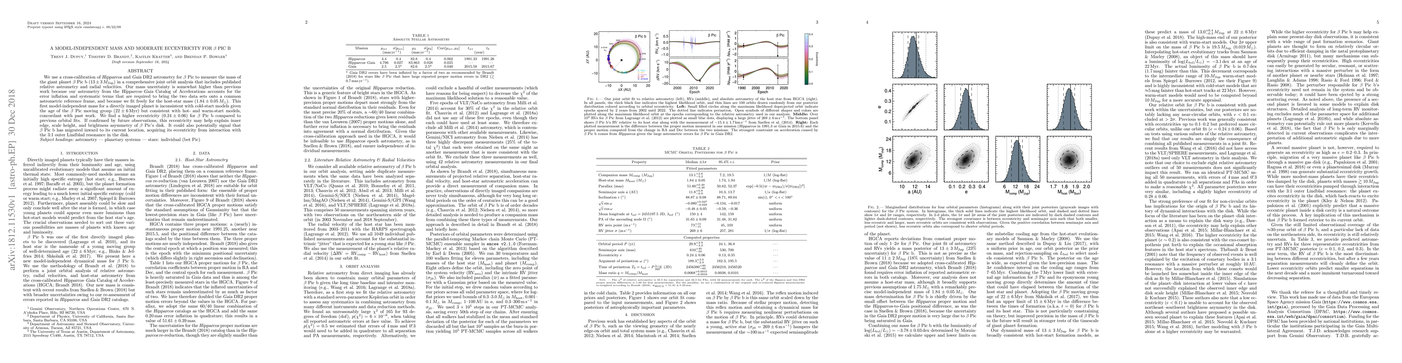 This research cross-calibrates Hipparcos and Gaia DR2 astrometry to determine a model-independent mass of 13±3 MJup for the planet β Pic b, higher than previous estimates due to comprehensive error accounting. The planet's higher eccentricity (0.24±0.06) suggests it may have migrated inward, potentially influencing its disk’s characteristics.
