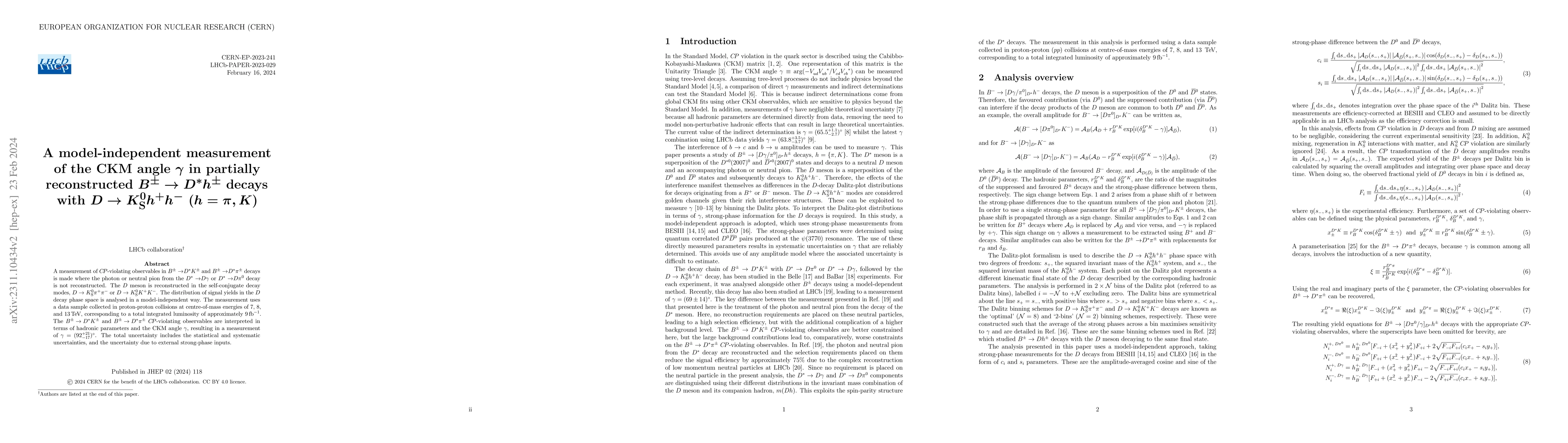 This paper presents a model-independent measurement of the CKM angle $\gamma$ using $B^{\pm} \to D^{*} h^{\pm}$ decays with partially reconstructed $D$ mesons. The study yields $\gamma = (92^{+21}_{-17})^{\circ}$ with a comprehensive analysis of the $C\!P$-violating observables.