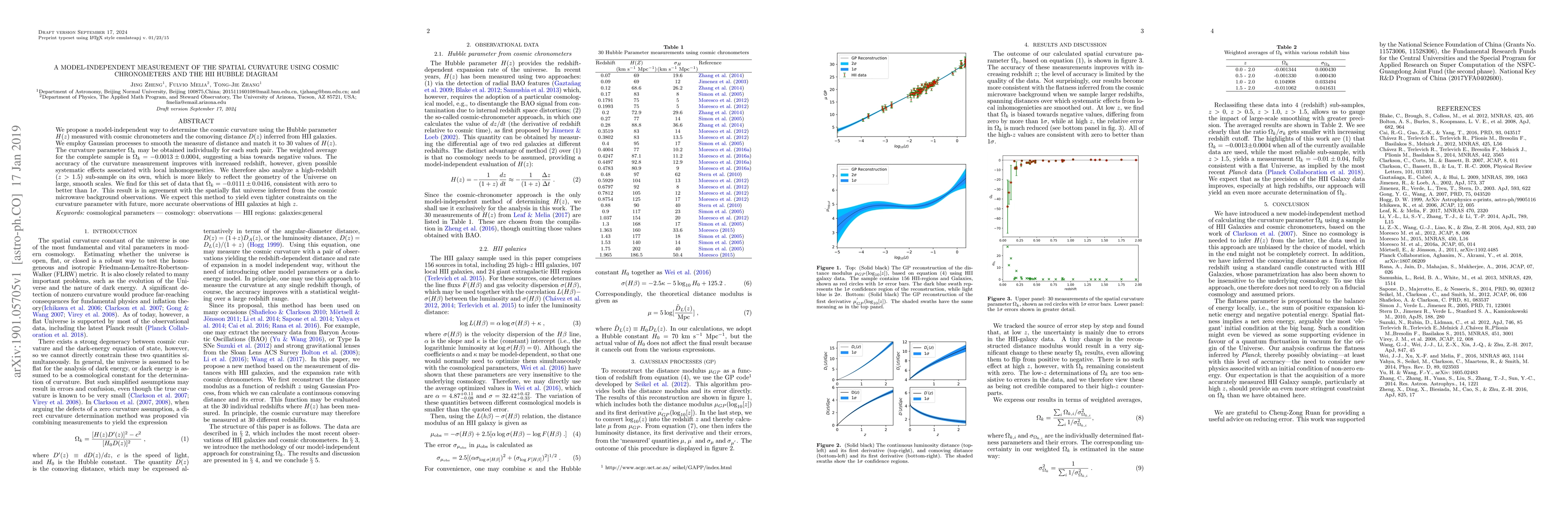 This paper presents a model-independent method to measure the spatial curvature of the universe using cosmic chronometers and HII galaxies to derive the Hubble parameter and comoving distance. The results suggest a slight negative curvature, consistent with a flat universe when considering high-redshift data.