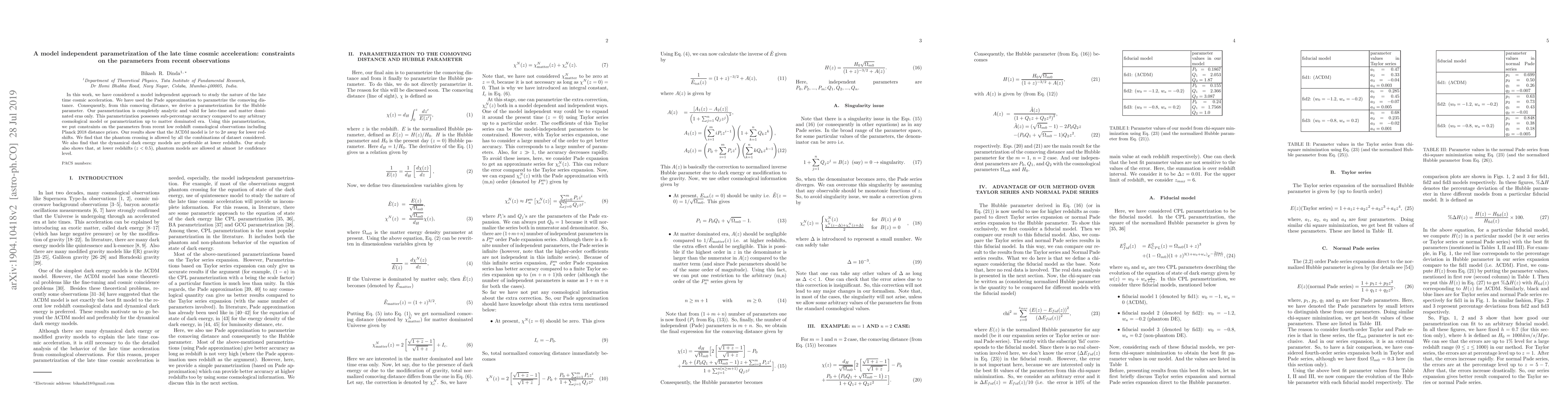 In this work, we have considered a model independent approach to study the nature of the late time cosmic acceleration. We have used the Pade approximation to parametrize the comoving distance. Consequently, from this comoving distance, we derive a parameterization for the Hubble parameter. Our parametrization is completely analytic and valid for late-time and matter dominated eras only. This parametrization possesses sub-percentage accuracy compared to any arbitrary cosmological model or parametrization up to matter dominated era. Using this parametrization, we put constraints on the parameters from recent low redshift cosmological observations including Planck 2018 distance priors. Our results show that the $\Lambda$CDM model is 1$\sigma$ to 2$\sigma$ away for lower redshifts. We find that the phantom crossing is allowed by all the combinations of dataset considered. We also find that the dynamical dark energy models are preferable at lower redshifts. Our study also shows that, at lower redshifts ($z<0.5$), phantom models are allowed at almost 1$\sigma$ confidence level.