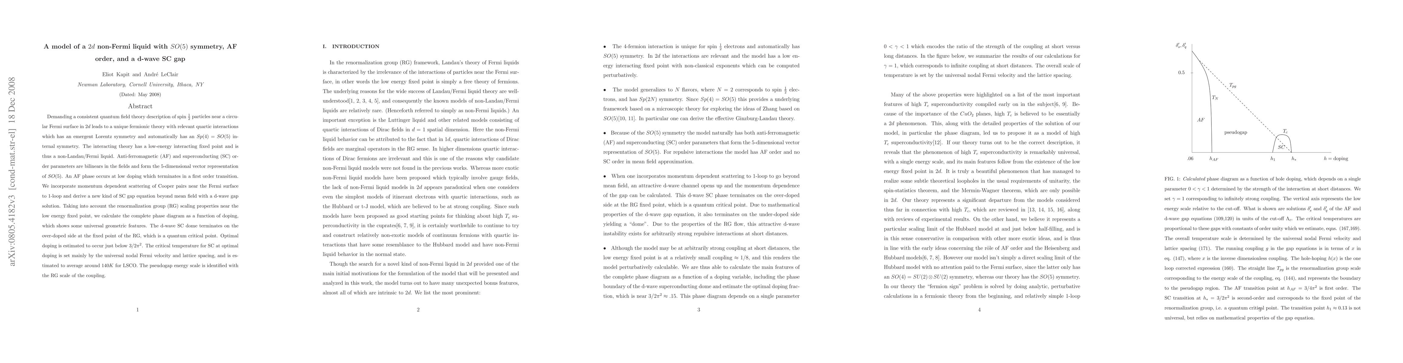 Demanding a consistent quantum field theory description of spin 1/2 particles near a circular Fermi surface in 2d leads to a unique fermionic theory with relevant quartic interactions which has an emergent Lorentz symmetry and automatically has an Sp(4) = SO(5) internal symmetry. The free theory has resistivity linear in temperature. The interacting theory has a low-energy interacting fixed point and is thus a non-Landau/Fermi liquid. Anti-ferromagnetic (AF) and superconducting (SC) order parameters are bilinears in the fields and form the 5-dimensional vector representation of SO(5). An AF phase occurs at low doping which terminates in a first order transition. We incorporate momentum dependent scattering of Cooper pairs near the Fermi surface to 1-loop and derive a new kind of SC gap equation beyond mean field with a d-wave gap solution. Taking into account the renormalization group (RG) scaling properties near the low energy fixed point, we calculate the complete phase diagram as a function of doping, which shows some universal geometric features. The d-wave SC dome terminates on the over-doped side at the fixed point of the RG,which is a quantum critical point. Optimal doping is estimated to occur just below 3/2\pi^2. The critical temperature for SC at optimal doping is set mainly by the universal nodal Fermi velocity and lattice spacing, and is estimated to average around 140K for LSCO. The pseudogap energy scale is identified as the RG scale of the coupling.
