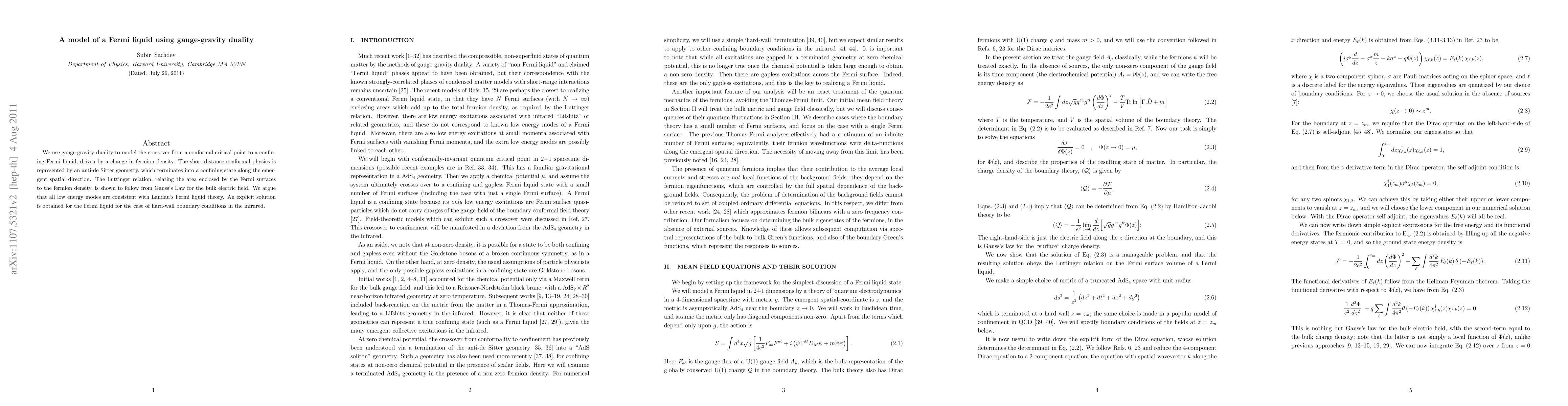 This paper models the transition from a conformal critical point to a confining Fermi liquid using gauge-gravity duality, showing the Luttinger relation follows from Gauss's Law for the bulk electric field, and demonstrates consistency with Landau's Fermi liquid theory through an explicit solution under hard-wall boundary conditions.