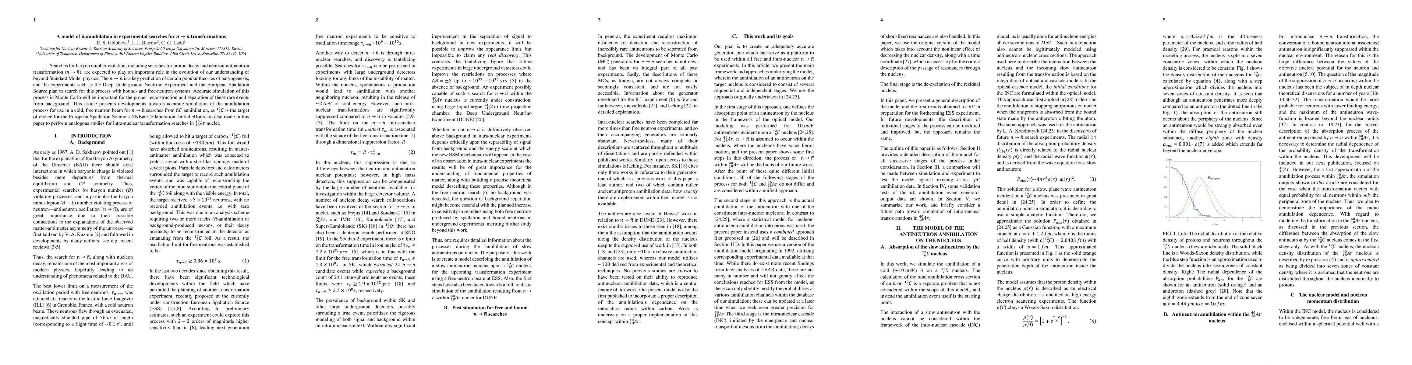 This paper develops a model for antineutron annihilation in neutron-antineutron transformation searches, focusing on the simulation of annihilation processes in carbon-12 for the European Spallation Source's NNBar Collaboration. Initial studies for argon-40 intra-nuclear transformations are also presented, with more detailed analysis to follow in a future publication.
