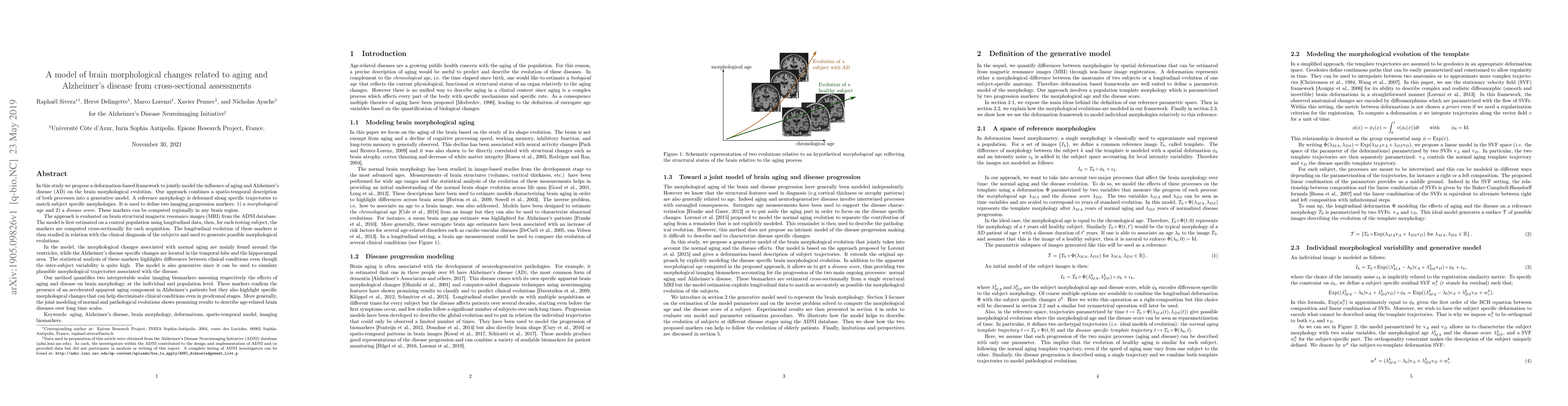 In this study we propose a deformation-based framework to jointly model the influence of aging and Alzheimer's disease (AD) on the brain morphological evolution. Our approach combines a spatio-temporal description of both processes into a generative model. A reference morphology is deformed along specific trajectories to match subject specific morphologies. It is used to define two imaging progression markers: 1) a morphological age and 2) a disease score. These markers can be computed locally in any brain region. The approach is evaluated on brain structural magnetic resonance images (MRI) from the ADNI database. The generative model is first estimated on a control population, then, for each subject, the markers are computed for each acquisition. The longitudinal evolution of these markers is then studied in relation with the clinical diagnosis of the subjects and used to generate possible morphological evolution. In the model, the morphological changes associated with normal aging are mainly found around the ventricles, while the Alzheimer's disease specific changes are more located in the temporal lobe and the hippocampal area. The statistical analysis of these markers highlights differences between clinical conditions even though the inter-subject variability is quiet high. In this context, the model can be used to generate plausible morphological trajectories associated with the disease. Our method gives two interpretable scalar imaging biomarkers assessing the effects of aging and disease on brain morphology at the individual and population level. These markers confirm an acceleration of apparent aging for Alzheimer's subjects and can help discriminate clinical conditions even in prodromal stages. More generally, the joint modeling of normal and pathological evolutions shows promising results to describe age-related brain diseases over long time scales.
