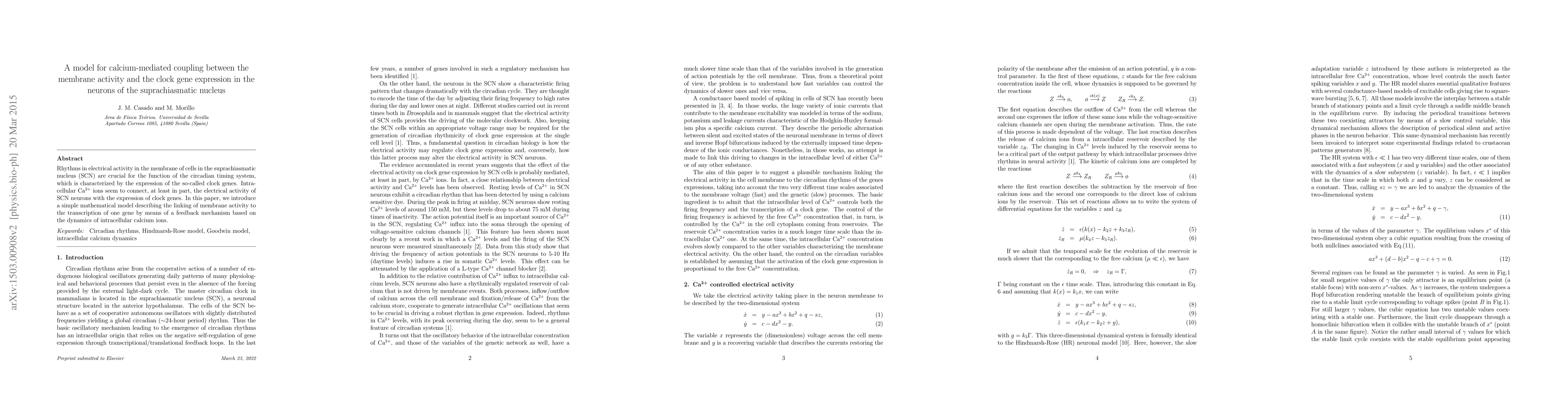 This paper proposes a mathematical model illustrating how intracellular calcium ions mediate the coupling between membrane electrical activity in the suprachiasmatic nucleus neurons and the expression of circadian clock genes through a feedback mechanism. The model aims to elucidate the role of calcium in linking neuronal activity with gene transcription.