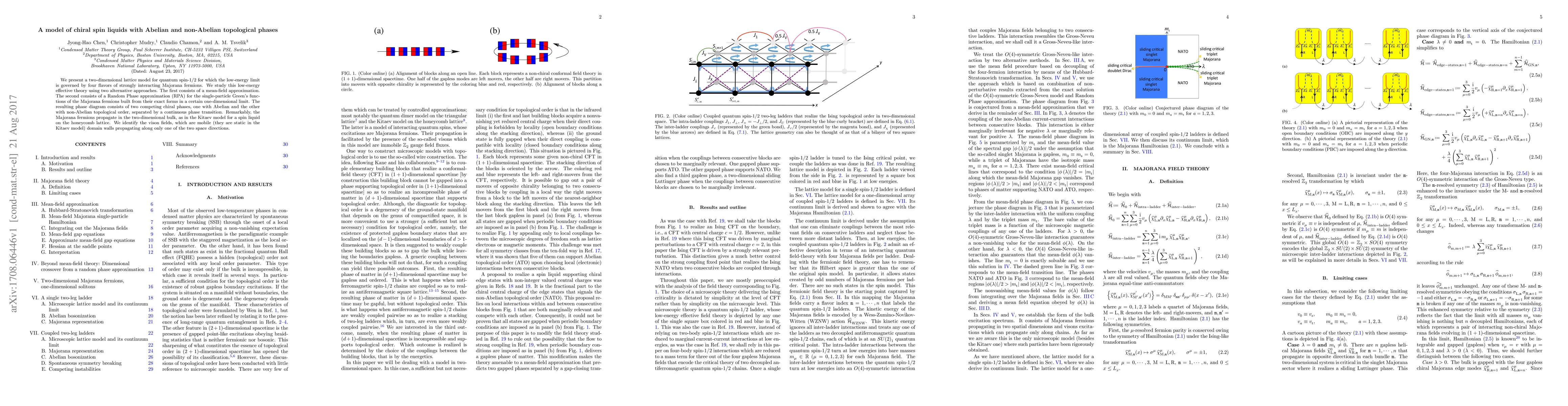 We present a two-dimensional lattice model for quantum spin-1/2 for which the low-energy limit is governed by four flavors of strongly interacting Majorana fermions. We study this low-energy effective theory using two alternative approaches. The first consists of a mean-field approximation. The second consists of a Random Phase approximation (RPA) for the single-particle Green's functions of the Majorana fermions built from their exact forms in a certain one-dimensional limit. The resulting phase diagram consists of two competing chiral phases, one with Abelian and the other with non-Abelian topological order, separated by a continuous phase transition. Remarkably, the Majorana fermions propagate in the two-dimensional bulk, as in the Kitaev model for a spin liquid on the honeycomb lattice. We identify the vison fields, which are mobile (they are static in the Kitaev model) domain walls propagating along only one of the two space directions.