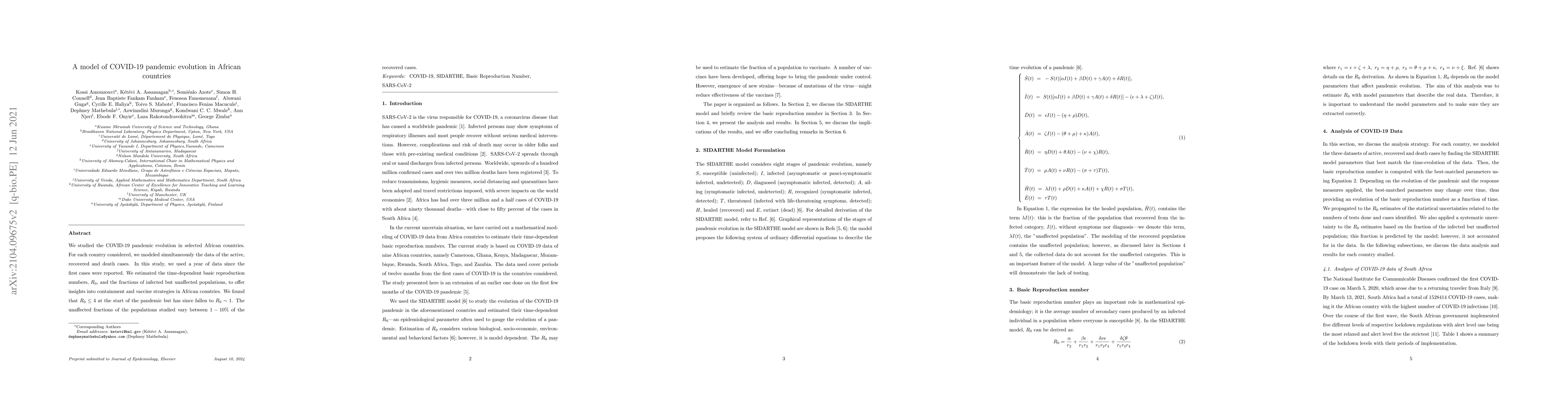 We studied the COVID-19 pandemic evolution in selected African countries. For each country considered, we modeled simultaneously the data of the active, recovered and death cases. In this study, we used a year of data since the first cases were reported. We estimated the time-dependent basic reproduction numbers, $R_0$, and the fractions of infected but unaffected populations, to offer insights into containment and vaccine strategies in African countries. We found that $R_0\leq 4$ at the start of the pandemic but has since fallen to $R_0 \sim 1$. The unaffected fractions of the populations studied vary between $1-10$\% of the recovered cases.