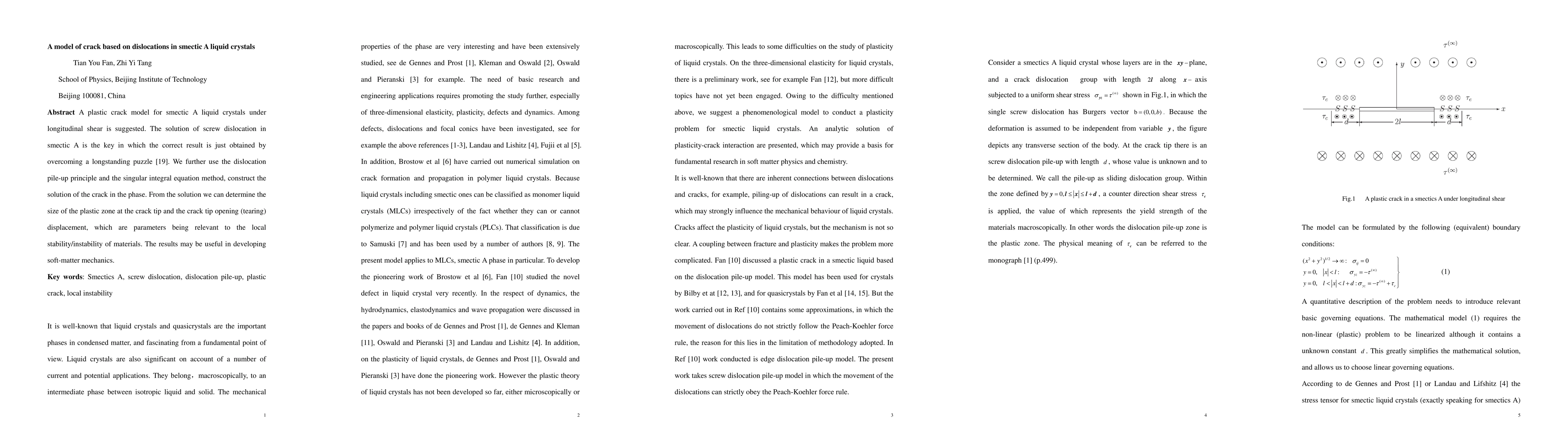 This paper proposes a plastic crack model for smectic A liquid crystals based on screw dislocations, resolving a longstanding puzzle. The study utilizes dislocation pile-up and singular integral equations to determine crack tip parameters, which are crucial for understanding material stability in soft-matter mechanics.