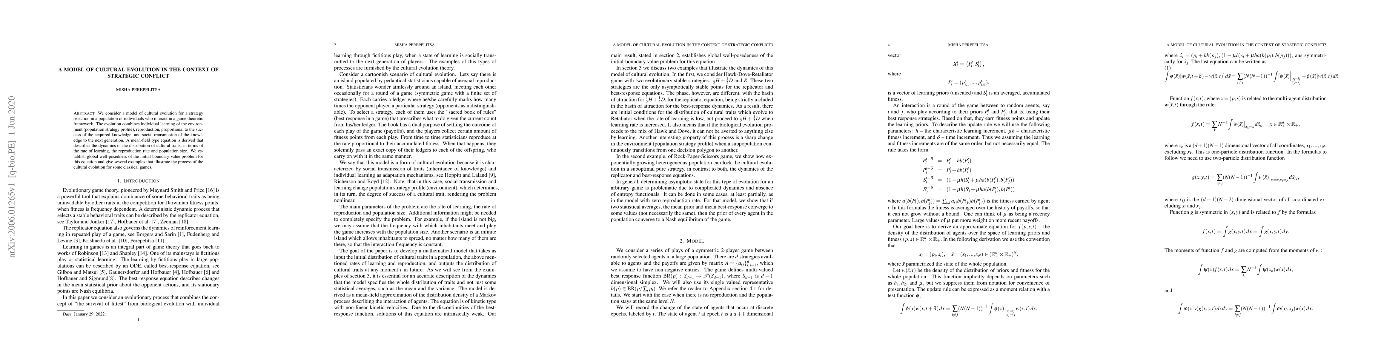 This research develops a model for cultural evolution in strategic conflicts, incorporating individual learning, reproduction success, and social knowledge transmission. The study derives a mean-field equation to describe the distribution dynamics of cultural traits and proves its global well-posedness, using classical games to illustrate cultural evolution processes.
