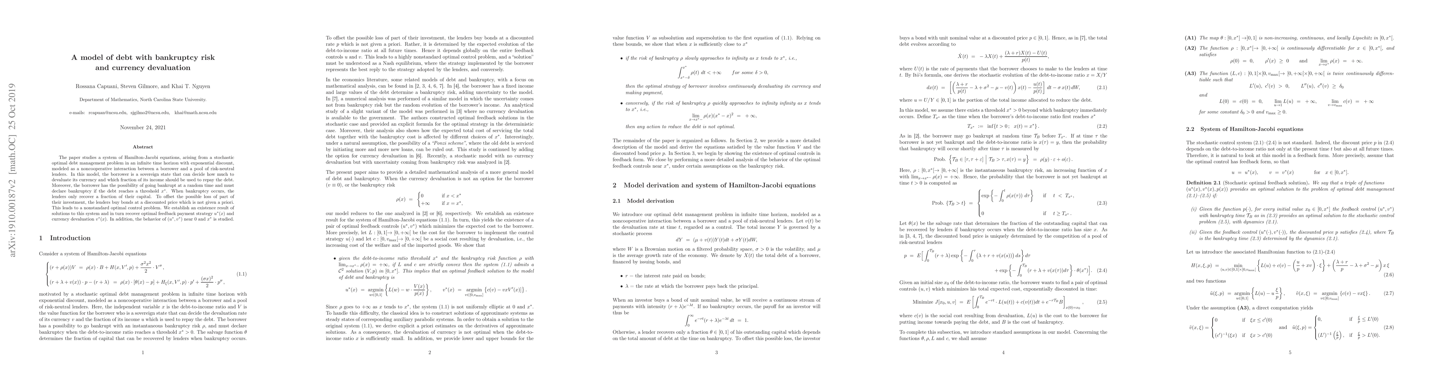 The paper studies a system of Hamilton-Jacobi equations, arising from a stochastic optimal debt management problem in an infinite time horizon with exponential discount, modeled as a noncooperative interaction between a borrower and a pool of risk-neutral lenders. In this model, the borrower is a sovereign state that can decide how much to devaluate its currency and which fraction of its income should be used to repay the debt. Moreover, the borrower has the possibility of going bankrupt at a random time and must declare bankruptcy if the debt reaches a threshold x*. When bankruptcy occurs, the lenders only recover a fraction of their capital. To offset the possible loss of part of their investment, the lenders buy bonds at a discounted price which is not given a priori. This leads to a nonstandard optimal control problem. We establish an existence result of solutions to this system and in turn recover optimal feedback payment strategy $u*(x)$ and currency devaluation $v*(x)$. In addition, the behavior of $(u*,v*)$ near $0$ and x* is studied.
