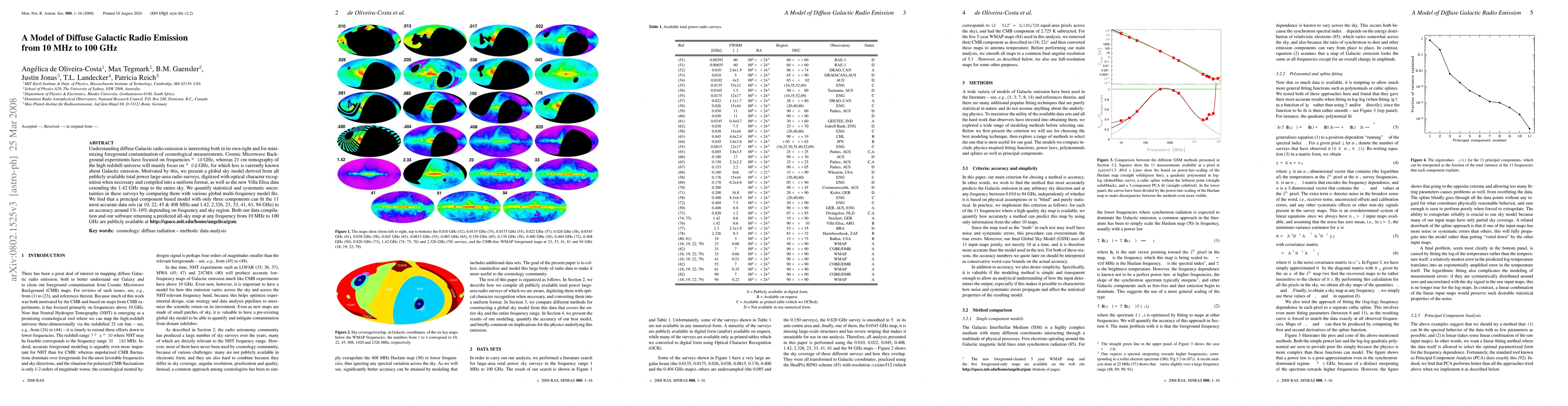 Understanding diffuse Galactic radio emission is interesting both in its own right and for minimizing foreground contamination of cosmological measurements. Cosmic Microwave Background experiments have focused on frequencies > 10 GHz, whereas 21 cm tomography of the high redshift universe will mainly focus on < 0.2 GHz, for which less is currently known about Galactic emission. Motivated by this, we present a global sky model derived from all publicly available total power large-area radio surveys, digitized with optical character recognition when necessary and compiled into a uniform format, as well as the new Villa Elisa data extending the 1.4 GHz map to the entire sky. We quantify statistical and systematic uncertainties in these surveys by comparing them with various global multi-frequency model fits. We find that a principal component based model with only three components can fit the 11 most accurate data sets (at 10, 22, 45 & 408 MHz and 1.4, 2.3, 23, 33, 41, 61, 94 GHz) to an accuracy around 1%-10% depending on frequency and sky region. Both our data compilation and our software returning a predicted all-sky map at any frequency from 10 MHz to 100 GHz are publicly available at http://space.mit.edu/home/angelica/gsm .