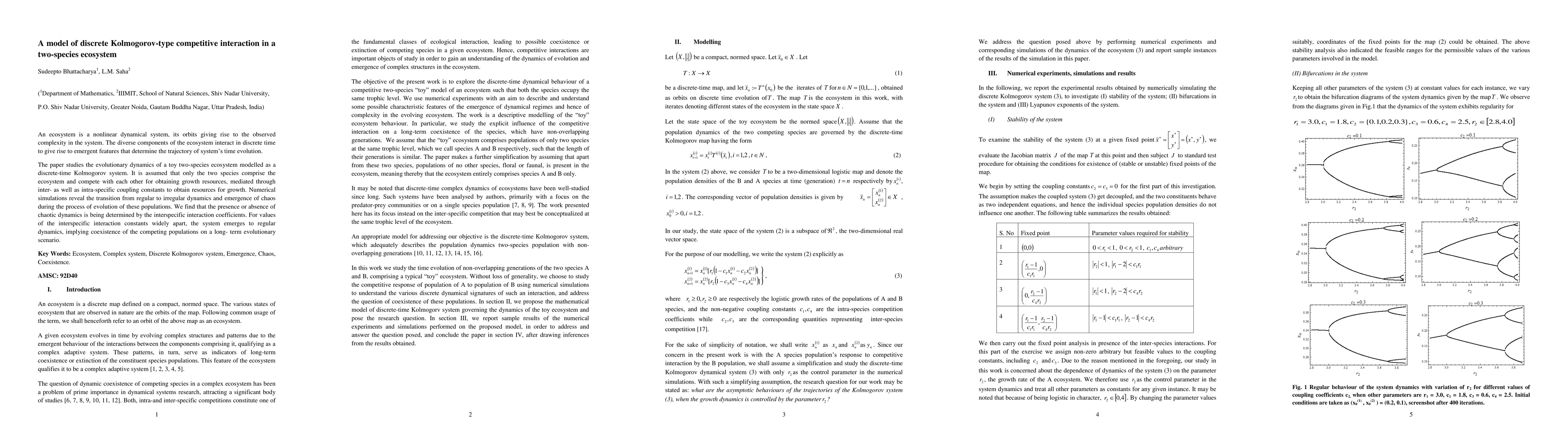 A two-species ecosystem model exhibits transition from regular to chaotic dynamics, influenced by interspecific interaction coefficients, with coexistence emerging for widely apart constants.
