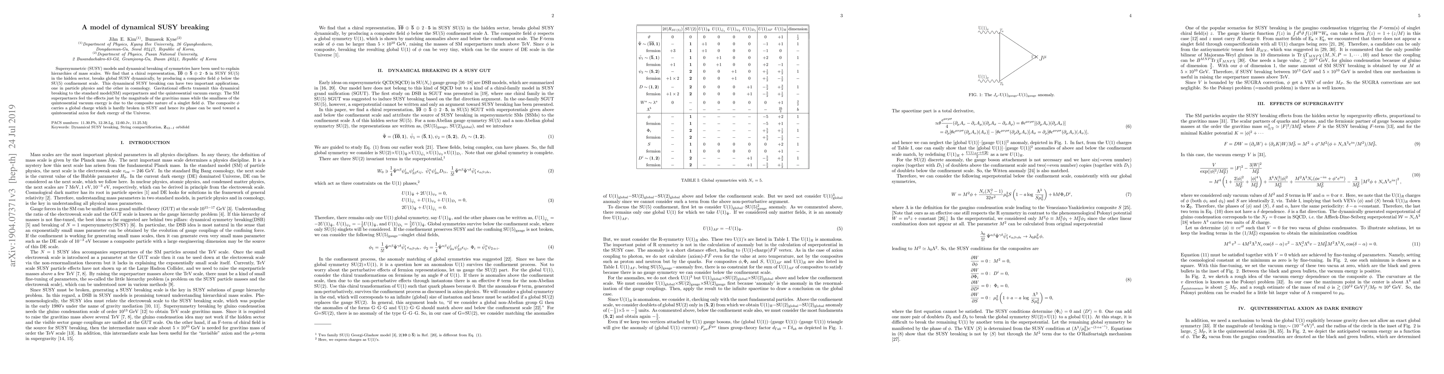 This paper proposes a model where dynamical supersymmetry (SUSY) breaking occurs in a chiral representation within SUSY SU(5), leading to the emergence of a composite field $\phi$. This dynamical breaking influences both particle physics and cosmology, transmitting effects to standard model superpartners and contributing to the smallness of quintessential vacuum energy, potentially serving as a dark energy axion.