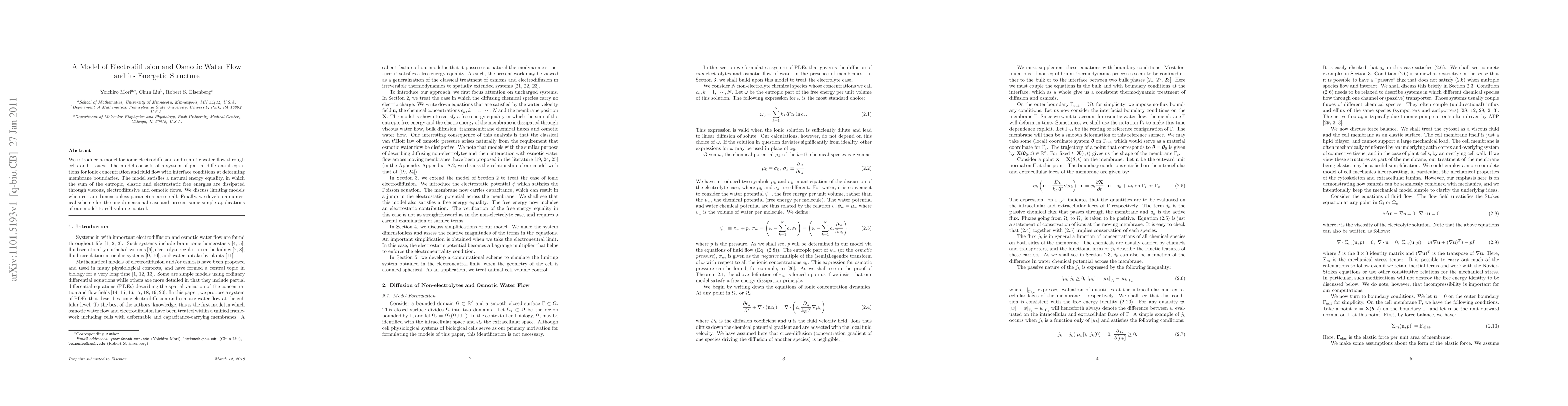 We introduce a model for ionic electrodiffusion and osmotic water flow through cells and tissues. The model consists of a system of partial differential equations for ionic concentration and fluid flow with interface conditions at deforming membrane boundaries. The model satisfies a natural energy equality, in which the sum of the entropic, elastic and electrostatic free energies are dissipated through viscous, electrodiffusive and osmotic flows. We discuss limiting models when certain dimensionless parameters are small. Finally, we develop a numerical scheme for the one-dimensional case and present some simple applications of our model to cell volume control.