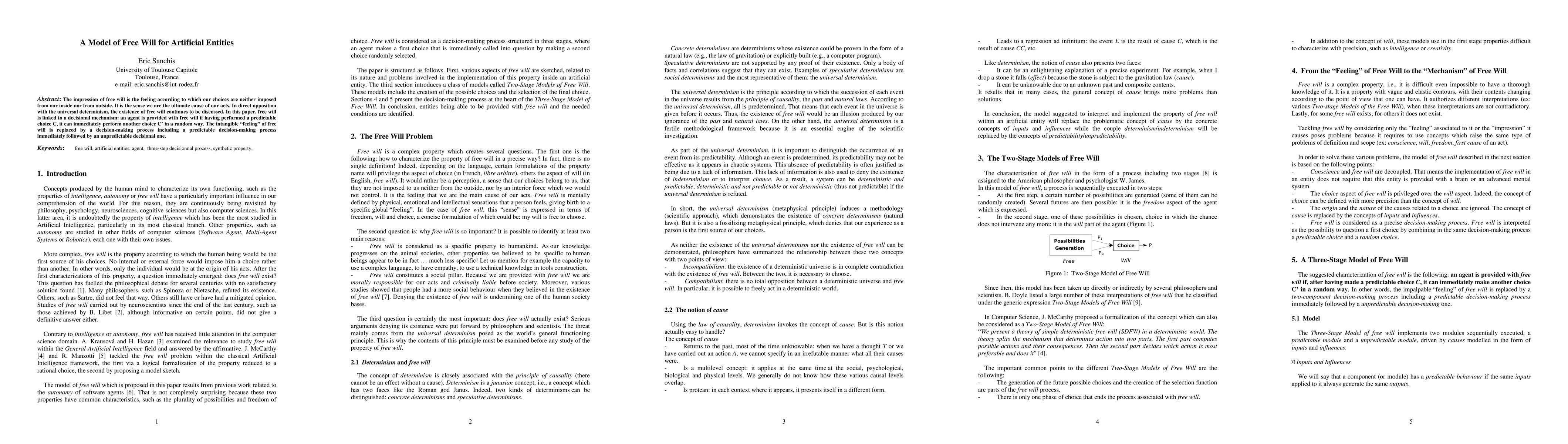 The impression of free will is the feeling according to which our choices are neither imposed from our inside nor from outside. It is the sense we are the ultimate cause of our acts. In direct opposition with the universal determinism, the existence of free will continues to be discussed. In this paper, free will is linked to a decisional mechanism: an agent is provided with free will if having performed a predictable choice Cp, it can immediately perform another choice Cr in a random way. The intangible feeling of free will is replaced by a decision-making process including a predictable decision-making process immediately followed by an unpredictable decisional one.