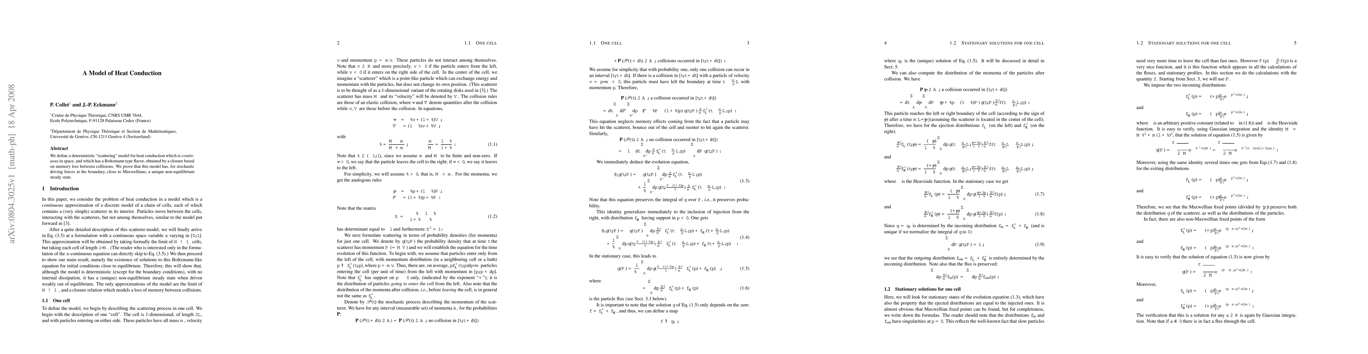 This paper introduces a deterministic heat conduction model, inspired by Boltzmann's approach, which considers 'scattering' and memory loss between collisions. It's proven to have a unique non-equilibrium steady state for stochastic boundary forces.