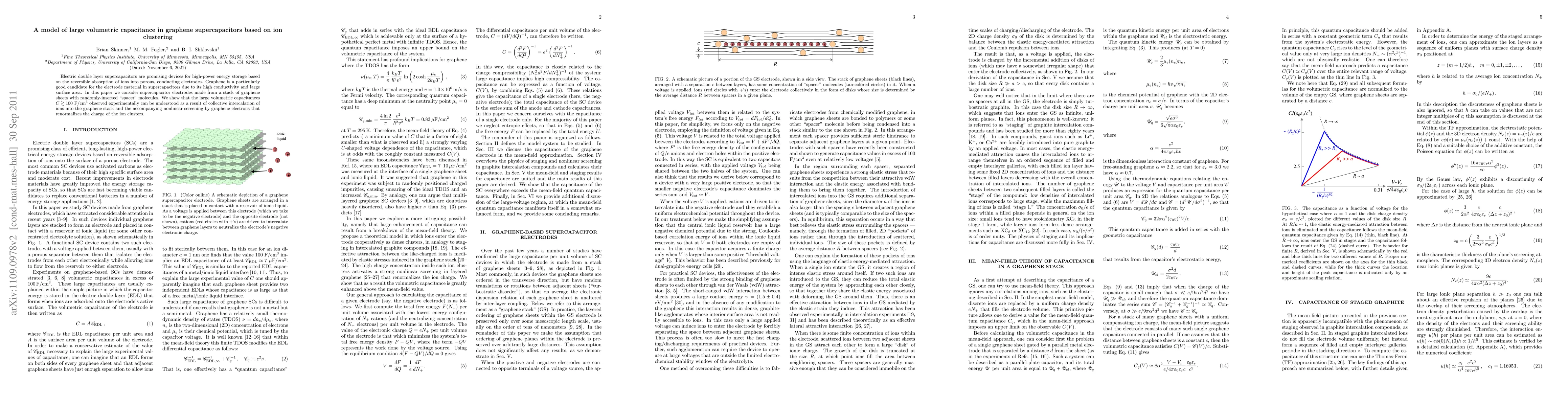 This paper proposes a model explaining the large volumetric capacitance in graphene supercapacitors through ion clustering and nonlinear screening by graphene electrons, attributing the observed capacitances of over 100 F/cm³ to the collective intercalation of ions into stacked graphene sheets with spacer molecules.