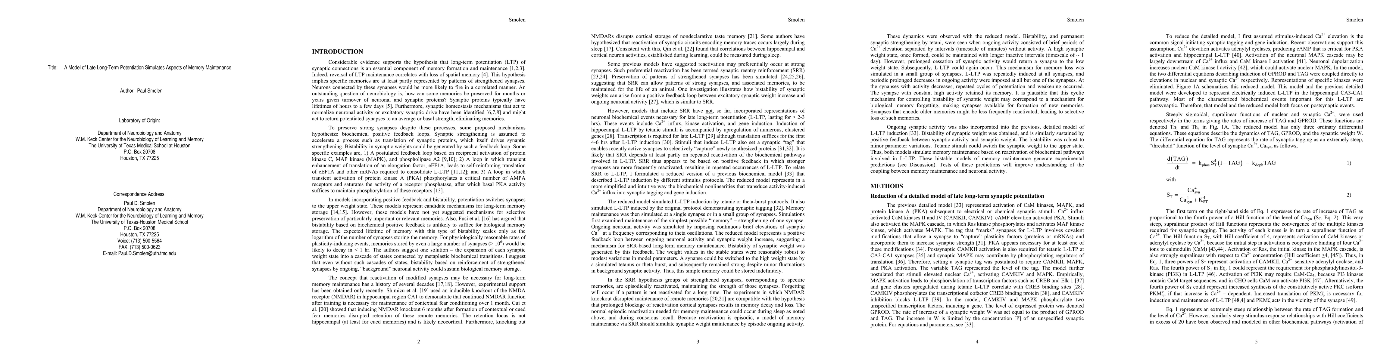 This paper develops mathematical models to simulate late long-term potentiation (L-LTP) and explores how ongoing neuronal activity might maintain synaptic strength and memory over time. The models show bistability in synaptic weights, suggesting a mechanism for memory preservation and forgetting.