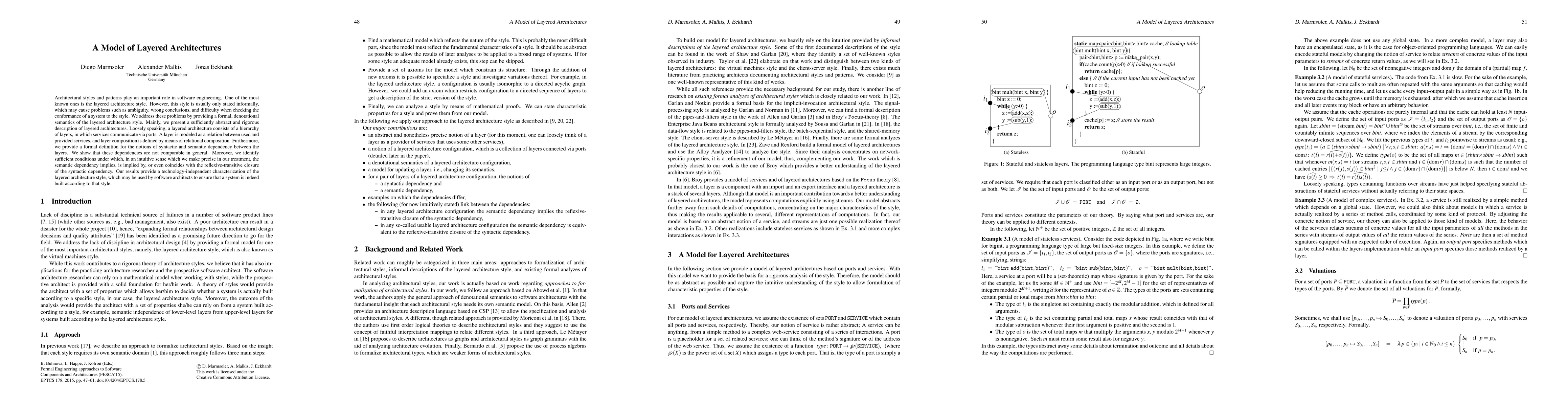 This paper provides a formal model of layered architectures in software engineering, defining layers as relations between services and providing conditions for semantic dependency to imply syntactic dependency. It aims to ensure that systems adhere to the layered architecture style.
