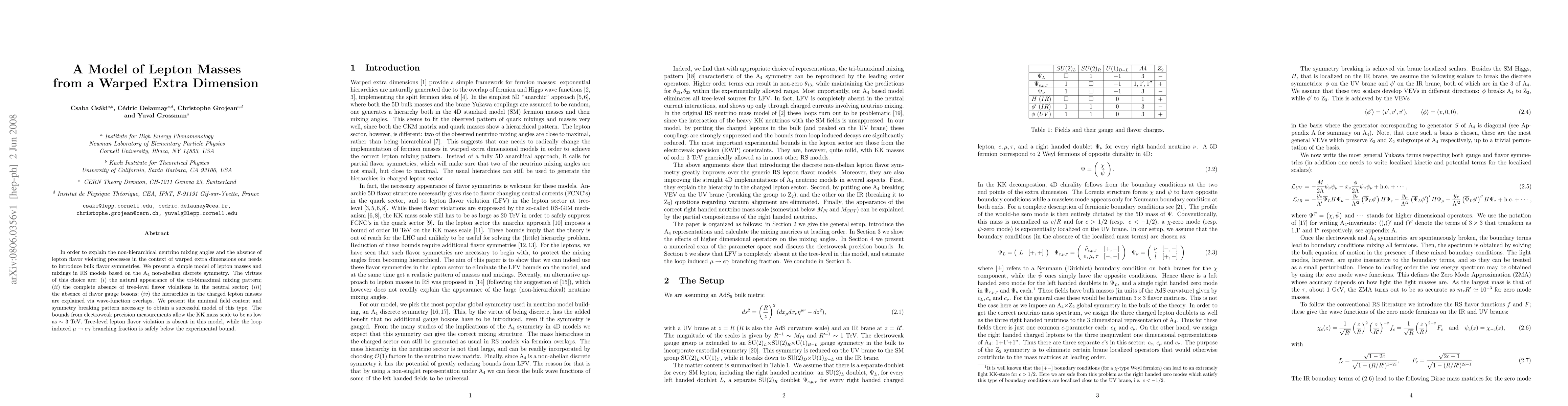In order to explain the non-hierarchical neutrino mixing angles and the absence of lepton flavor violating processes in the context of warped extra dimensions one needs to introduce bulk flavor symmetries. We present a simple model of lepton masses and mixings in RS models based on the A4 non-abelian discrete symmetry. The virtues of this choice are: (i) the natural appearance of the tri-bimaximal mixing pattern; (ii) the complete absence of tree-level flavor violations in the neutral sector; (iii) the absence of flavor gauge bosons; (iv) the hierarchies in the charged lepton masses are explained via wave-function overlaps. We present the minimal field content and symmetry breaking pattern necessary to obtain a successful model of this type. The bounds from electroweak precision measurements allow the KK mass scale to be as low as 3 TeV. Tree-level lepton flavor violation is absent in this model, while the loop induced mu -> e gamma branching fraction is safely below the experimental bound.