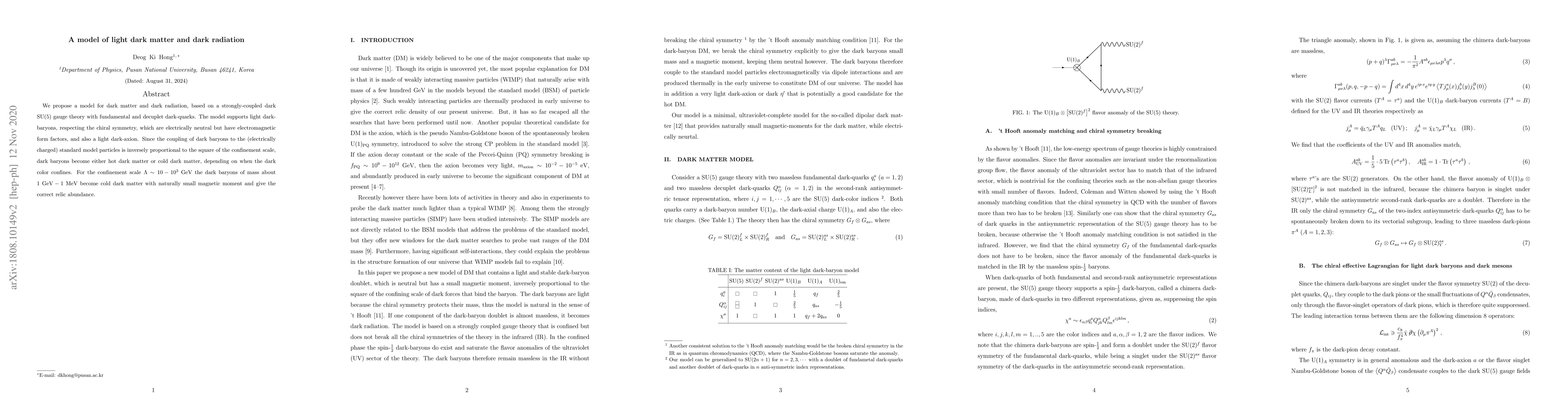 We propose a model for dark matter and dark radiation, based on a strongly-coupled dark ${\rm SU}(5)$ gauge theory with fundamental and decuplet dark-quarks. The model supports light dark-baryons, respecting the chiral symmetry, which are electrically neutral but have electromagnetic form factors, and also a light dark-axion. Since the coupling of dark baryons to the standard model particles is inversely proportional to the square of the confinement scale, dark baryons become either hot dark matter or cold dark matter, depending on when the dark color confines. For the confinement scale $\Lambda\sim 10-10^3~{\rm GeV}$ the dark baryons of mass about $ 1~{\rm GeV}-1~{\rm MeV}$ become cold dark matter with naturally small magnetic moment and give the correct relic abundance.