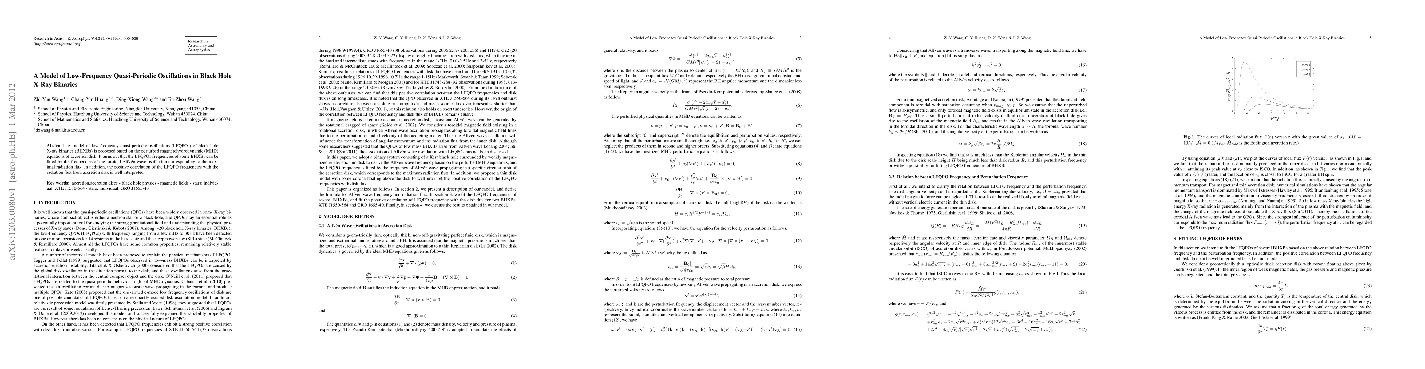This paper proposes a model for low-frequency quasi-periodic oscillations (LFQPOs) in black hole X-ray binaries based on perturbed magnetohydrodynamic equations of accretion disks. The model suggests that the LFQPO frequencies correlate with toroidal Alfvén wave oscillations and match the maximal radiation flux, explaining the positive correlation with accretion disk radiation.