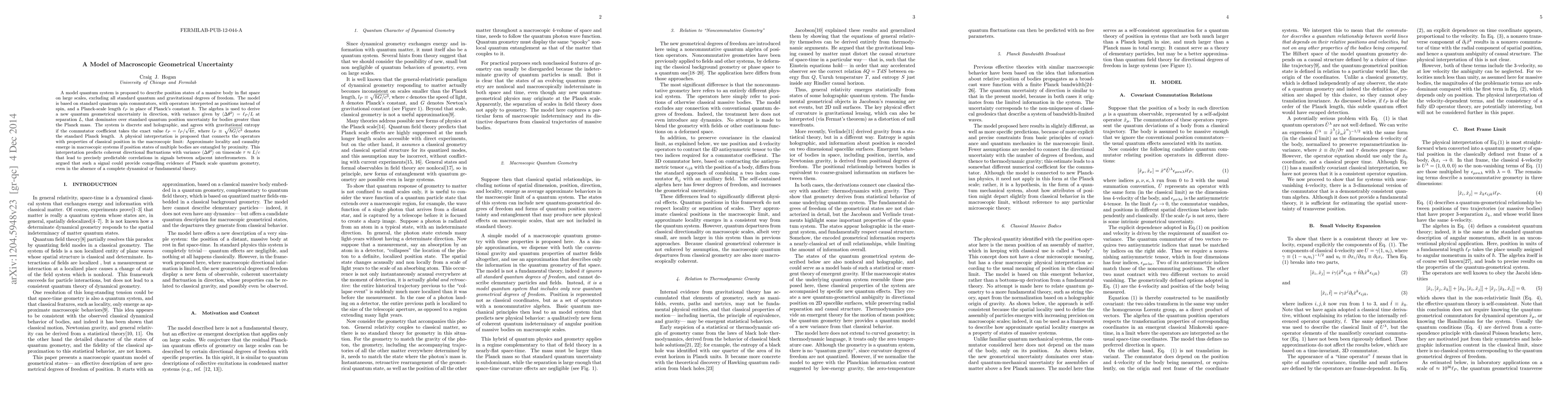 A model quantum system is proposed to describe position states of a massive body in flat space on large scales, excluding all standard quantum and gravitational degrees of freedom. The model is based on standard quantum spin commutators, with operators interpreted as positions instead of spin, and a Planck-scale length $\ell_P$ in place of Planck's constant $\hbar$. The algebra is used to derive a new quantum geometrical uncertainty in direction, with variance given by $\langle \Delta \theta^2\rangle = \ell_P/L$ at separation $L$, that dominates over standard quantum position uncertainty for bodies greater than the Planck mass. The system is discrete and holographic, and agrees with gravitational entropy if the commutator coefficient takes the exact value $\ell_P= l_P/\sqrt{4\pi}$, where $l_P\equiv \sqrt{\hbar G/c^3}$ denotes the standard Planck length. A physical interpretation is proposed that connects the operators with properties of classical position in the macroscopic limit: Approximate locality and causality emerge in macroscopic systems if position states of multiple bodies are entangled by proximity. This interpretation predicts coherent directional fluctuations with variance $\langle \Delta \theta^2\rangle $ on timescale $\tau \approx L/c$ that lead to precisely predictable correlations in signals between adjacent interferometers. It is argued that such a signal could provide compelling evidence of Planck scale quantum geometry, even in the absence of a complete dynamical or fundamental theory.