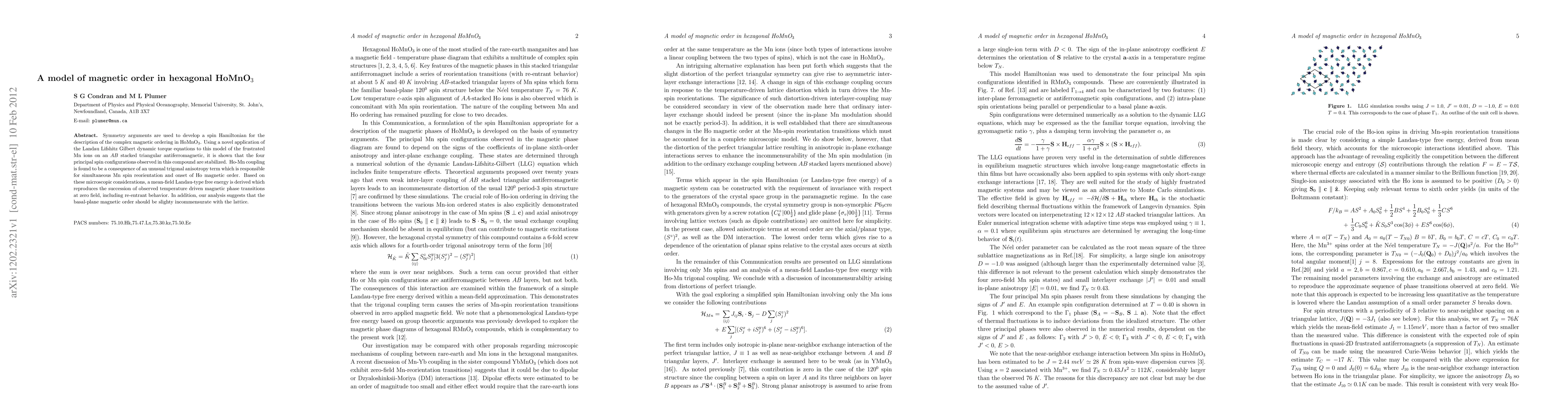 Researchers developed a spin Hamiltonian to describe HoMnO3's complex magnetic ordering, revealing that four principal configurations are stabilized due to an unusual trigonal anisotropy term and Ho-Mn coupling. The model reproduces the compound's observed temperature-driven magnetic phase transitions, including re-entrant behavior.