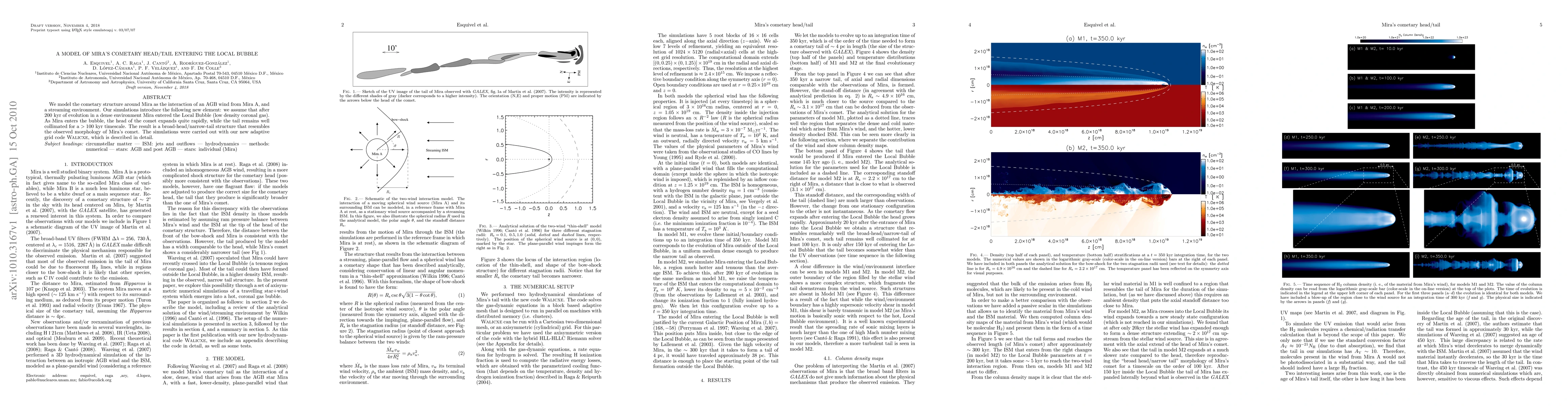 We model the cometary structure around Mira as the interaction of an AGB wind from Mira A, and a streaming environment. Our simulations introduce the following new element: we assume that after 200 kyr of evolution in a dense environment Mira entered the Local Bubble (low density coronal gas). As Mira enters the bubble, the head of the comet expands quite rapidly, while the tail remains well collimated for a 100 kyr timescale. The result is a broad-head/narrow-tail structure that resembles the observed morphology of Mira's comet. The simulations were carried out with our new adaptive grid code WALICXE, which is described in detail.