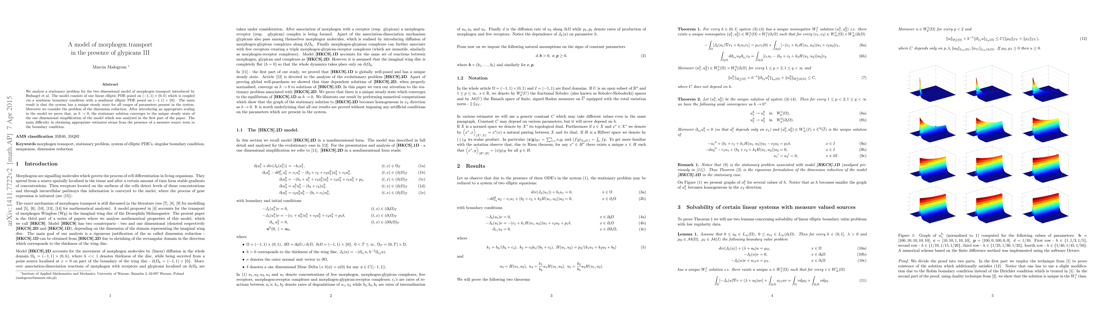 We analyse a stationary problem for the two dimensional model of morphogen transport introduced by Hufnagel et al. The model consists of one linear elliptic PDE posed on $(-1,1)\times(0,h)$ which is coupled via a nonlinear boundary condition with a nonlinear elliptic PDE posed on $(-1,1)\times\{0\}$. The main result is that the system has a unique steady state for all ranges of parameters present in the system. Moreover we consider the problem of the dimension reduction. After introducing an appropriate scaling in the model we prove that, as $h\to0$, the stationary solution converges to the unique steady state of the one dimensional simplification of the model which was analysed in the first part of the paper. The main difficulty in obtaining appropriate estimates stems from the presence of a measure source term in the boundary condition.