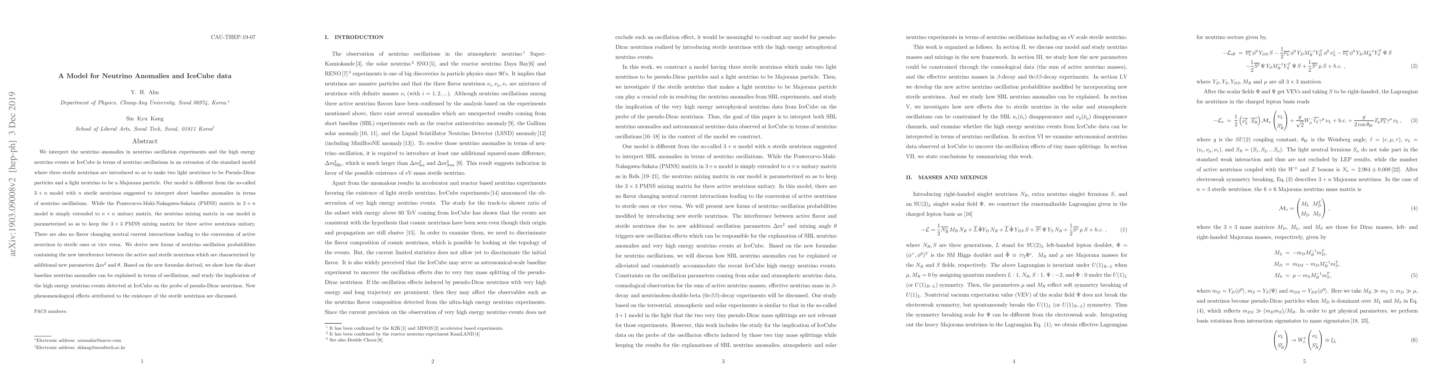 We interpret the neutrino anomalies in neutrino oscillation experiments and the high energy neutrino events at IceCube in terms of neutrino oscillations in an extension of the standard model where three sterile neutrinos are introduced so as to make two light neutrinos to be Pseudo-Dirac particles and a light neutrino to be a Majorana particle. Our model is different from the so-called $3+n$ model with $n$ sterile neutrinos suggested to interpret short baseline anomalies in terms of neutrino oscillations. While the Pontecorvo-Maki-Nakagawa-Sakata (PMNS) matrix in $3+n$ model is simply extended to $n\times n$ unitary matrix, the neutrino mixing matrix in our model is parameterized so as to keep the $3\times3$ PMNS mixing matrix for three active neutrinos unitary. There are also no flavor changing neutral current interactions leading to the conversion of active neutrinos to sterile ones or vice versa. We derive new forms of neutrino oscillation probabilities containing the new interference between the active and sterile neutrinos which are characterized by additional new parameters $\Delta m^2$ and $\theta$. Based on the new formulae derived, we show how the short baseline neutrino anomalies can be explained in terms of oscillations, and study the implication of the high energy neutrino events detected at IceCube on the probe of pseudo-Dirac neutrinos. New phenomenological effects attributed to the existence of the sterile neutrinos are discussed.