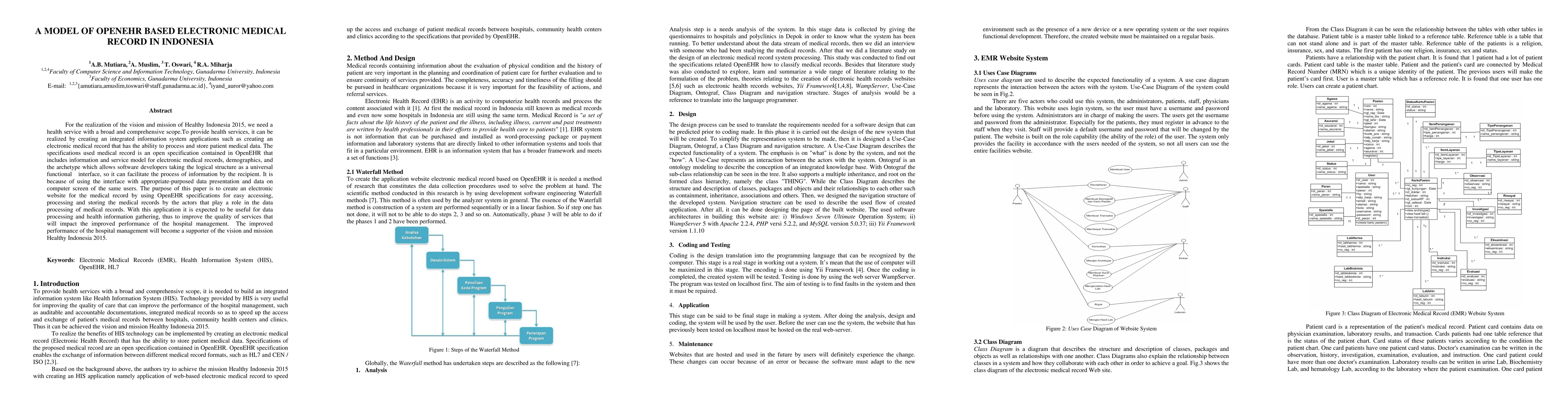 For the realization of the vision and mission of Healthy Indonesia 2015, we need a health service with a broad and comprehensive scope.To provide health services, it can be realized by creating an integrated information system applications such as creating an electronic medical record that has the ability to process and store patient medical data. The specifications used medical record is an open specification contained in OpenEHR that includes information and service model for electronic medical records, demographics, and the archetype which allows software developers taking the logical structure as a universal functional interface, so it can facilitate the process of information by the recipient. It is because of using the interface with appropriate-purposed data presentation and data on computer screen of the same users. The purpose of this paper is to create an electronic website for the medical record by using OpenEHR specifications for easy accessing, processing and storing the medical records by the actors that play a role in the data processing of medical records. With this application it is expected to be useful for data processing and health information gathering, thus to improve the quality of services that will impact the improved performance of the hospital management. The improved performance of the hospital management will become a supporter of the vision and mission Healthy Indonesia 2015.
