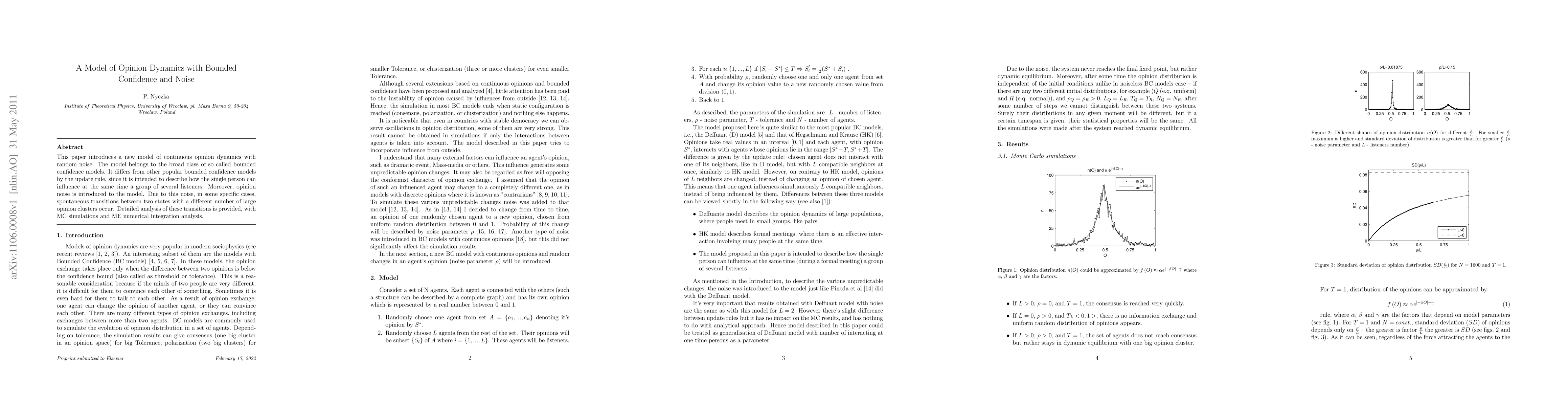 This paper introduces a new model of continuous opinion dynamics with random noise. The model belongs to the broad class of so called bounded confidence models. It differs from other popular bounded confidence models by the update rule, since it is intended to describe how the single person can influence at the same time a group of several listeners. Moreover, opinion noise is introduced to the model. Due to this noise, in some specific cases, spontaneous transitions between two states with a different number of large opinion clusters occur. Detailed analysis of these transitions is provided, with MC simulations and ME numerical integration analysis.