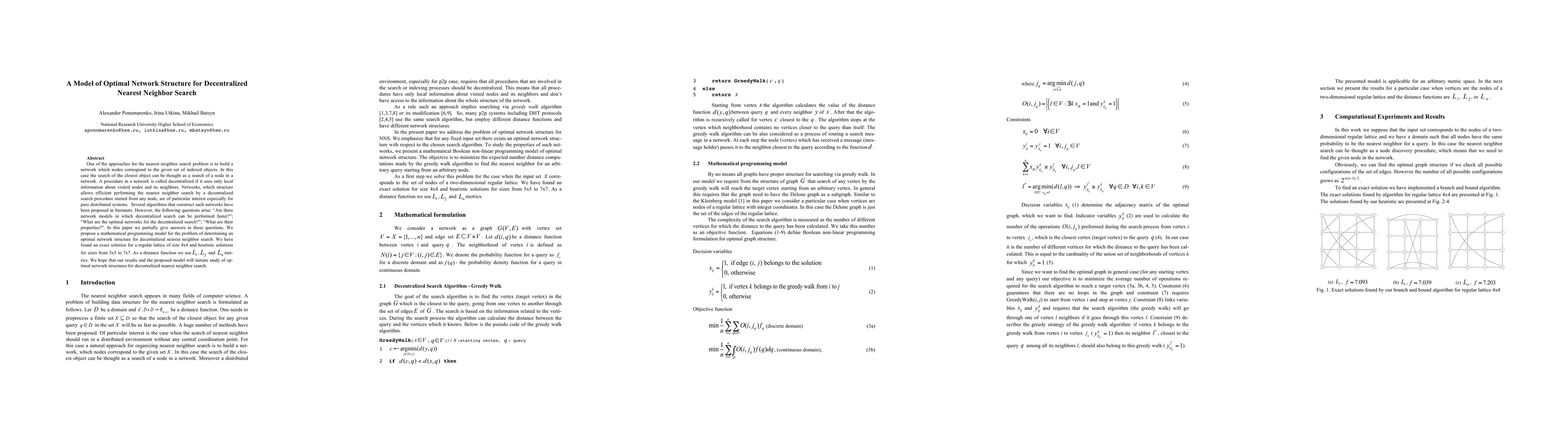 This paper proposes a mathematical model for optimal network structure in decentralized nearest neighbor search, finding exact solutions for 4x4 lattices and heuristic solutions for larger sizes.