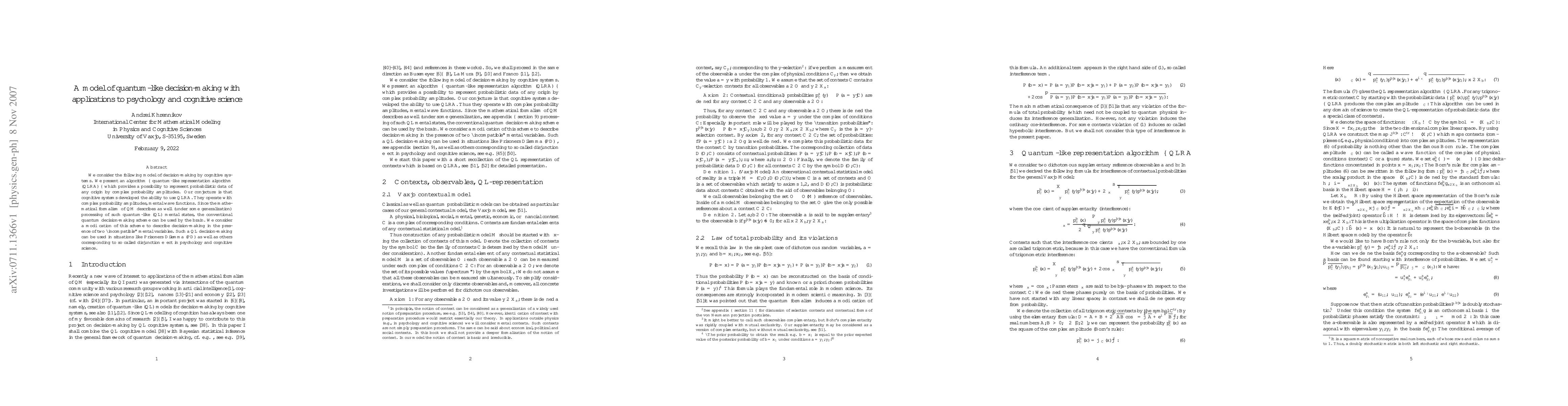 We consider the following model of decision-making by cognitive systems. We present an algorithm -- quantum-like representation algorithm (QLRA) -- which provides a possibility to represent probabilistic data of any origin by complex probability amplitudes. Our conjecture is that cognitive systems developed the ability to use QLRA. They operate with complex probability amplitudes, mental wave functions. Since the mathematical formalism of QM describes as well (under some generalization) processing of such quantum-like (QL) mental states, the conventional quantum decision-making scheme can be used by the brain. We consider a modification of this scheme to describe decision-making in the presence of two ``incompatible'' mental variables. Such a QL decision-making can be used in situations like Prisoners Dilemma (PD) as well as others corresponding to so called disjunction effect in psychology and cognitive science.
