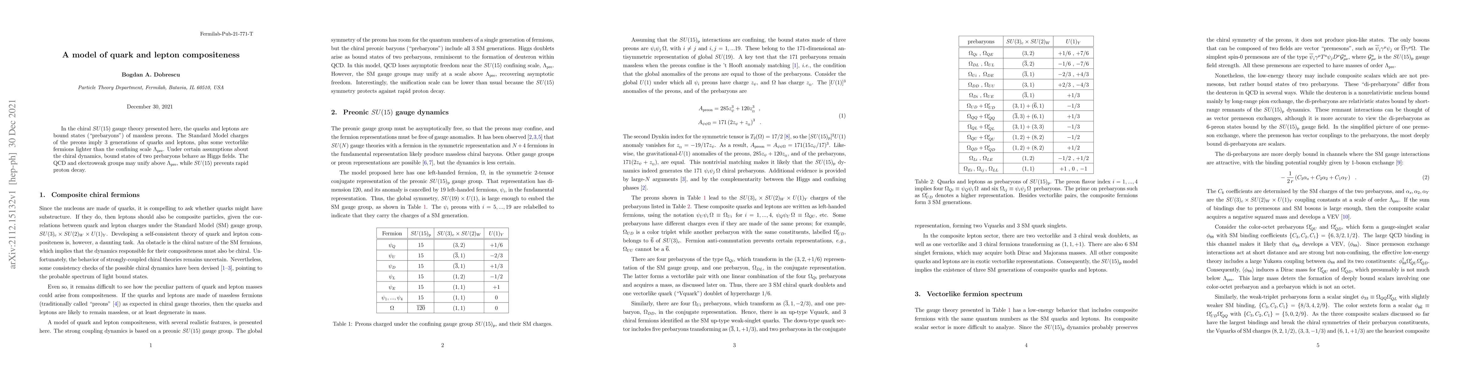 In the chiral $SU(15)$ gauge theory presented here, the quarks and leptons are bound states ("prebaryons") of massless preons. The Standard Model charges of the preons imply 3 generations of quarks and leptons, plus some vectorlike fermions lighter than the confining scale $\Lambda_{\rm pre}$. Under certain assumptions about the chiral dynamics, bound states of two prebaryons behave as Higgs fields. The QCD and electroweak groups may unify above $\Lambda_{\rm pre}$, while $SU(15)$ prevents rapid proton decay.