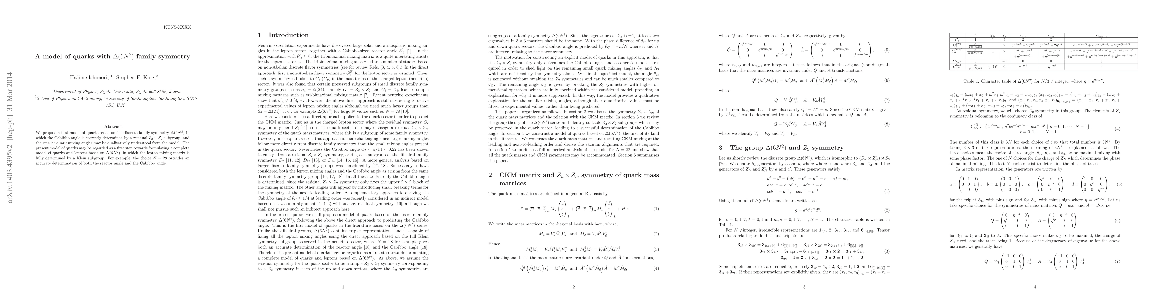 This paper proposes a quark model based on the Delta (6N^2) family symmetry, accurately determining the Cabibbo angle and qualitatively explaining smaller quark mixing angles. The model aims to lay the foundation for a complete quark and lepton framework, with N=28 offering precise values for both the Cabibbo and reactor angles.
