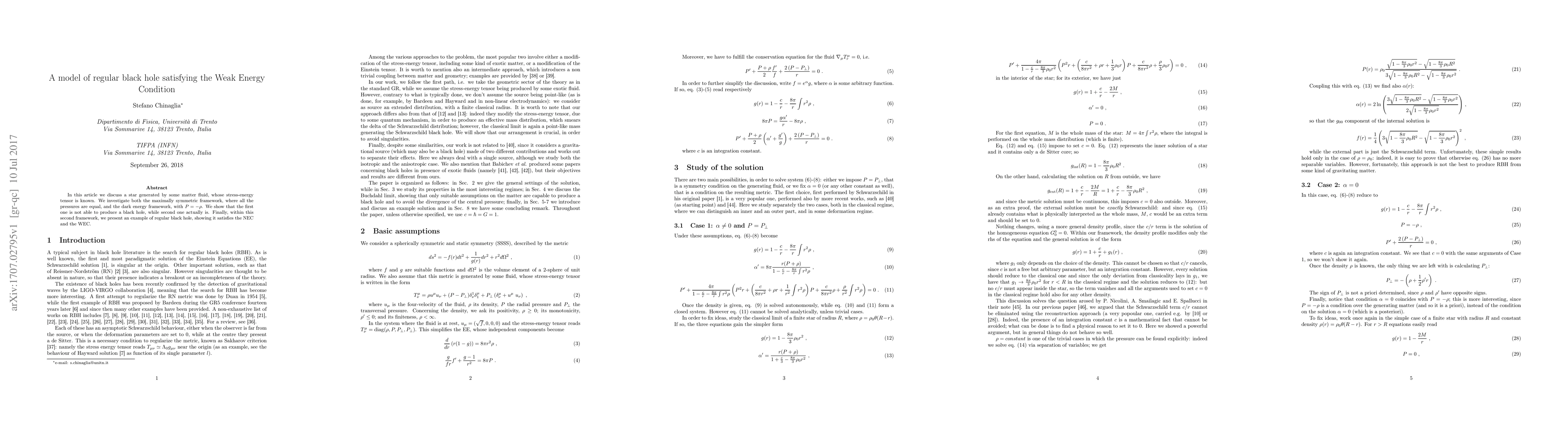 In this article we discuss a star generated by some matter fluid, whose stress-energy tensor is known. We investigate both the maximally symmetric framework, where all the pressures are equal, and the dark energy framework, with $P = -\rho$. We show that the first one is not able to produce a black hole, while second one actually is. Finally, within this second framework, we present an example of regular black hole, showing it satisfies the NEC and the WEC.