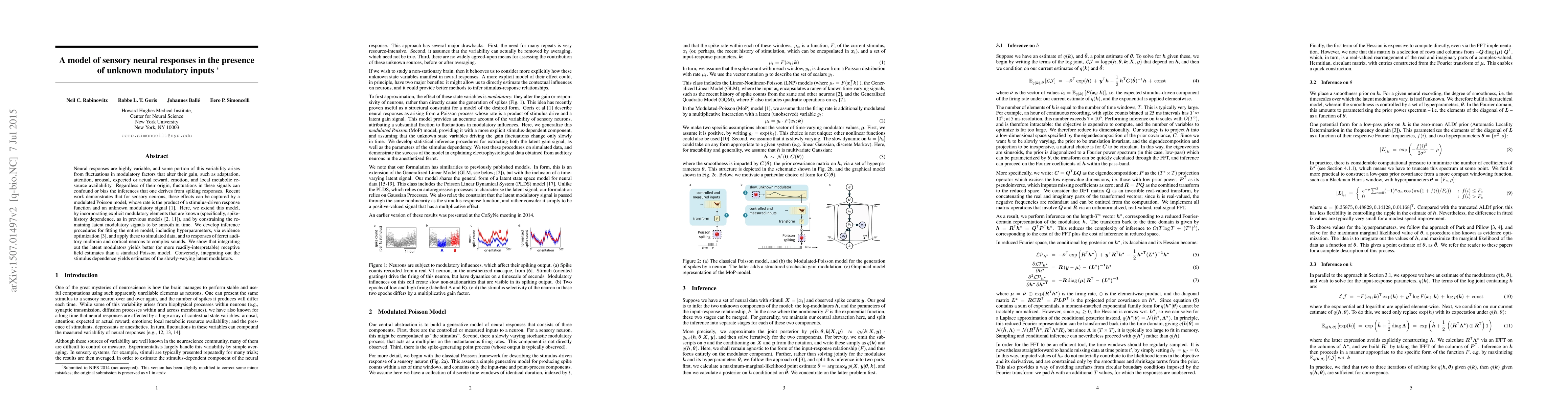 Neural responses are highly variable, and some portion of this variability arises from fluctuations in modulatory factors that alter their gain, such as adaptation, attention, arousal, expected or actual reward, emotion, and local metabolic resource availability. Regardless of their origin, fluctuations in these signals can confound or bias the inferences that one derives from spiking responses. Recent work demonstrates that for sensory neurons, these effects can be captured by a modulated Poisson model, whose rate is the product of a stimulus-driven response function and an unknown modulatory signal. Here, we extend this model, by incorporating explicit modulatory elements that are known (specifically, spike-history dependence, as in previous models), and by constraining the remaining latent modulatory signals to be smooth in time. We develop inference procedures for fitting the entire model, including hyperparameters, via evidence optimization, and apply these to simulated data, and to responses of ferret auditory midbrain and cortical neurons to complex sounds. We show that integrating out the latent modulators yields better (or more readily-interpretable) receptive field estimates than a standard Poisson model. Conversely, integrating out the stimulus dependence yields estimates of the slowly-varying latent modulators.