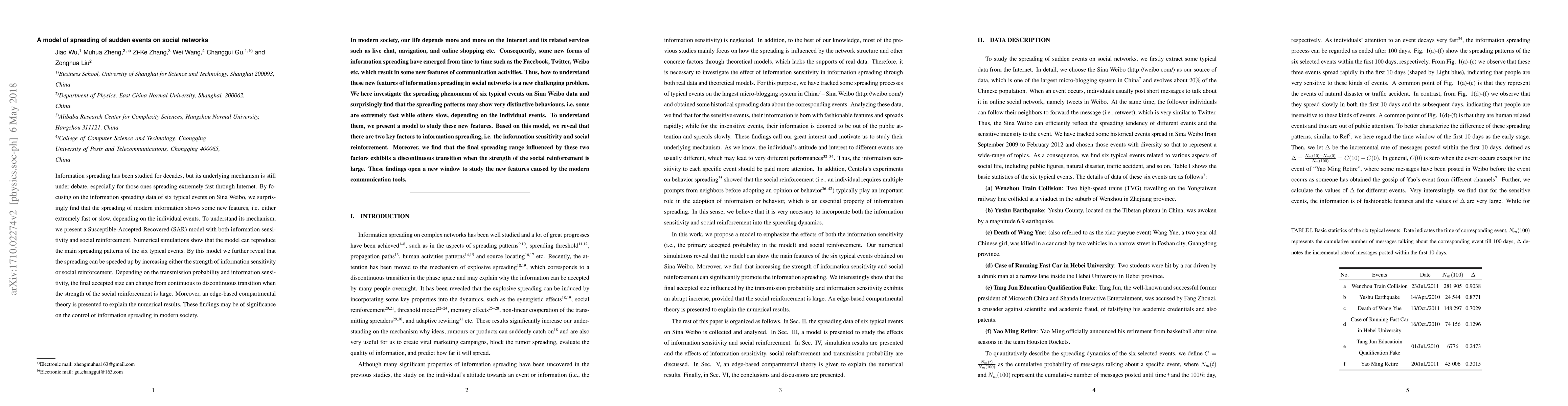Information spreading has been studied for decades, but its underlying mechanism is still under debate, especially for those ones spreading extremely fast through Internet. By focusing on the information spreading data of six typical events on Sina Weibo, we surprisingly find that the spreading of modern information shows some new features, i.e. either extremely fast or slow, depending on the individual events. To understand its mechanism, we present a Susceptible-Accepted-Recovered (SAR) model with both information sensitivity and social reinforcement. Numerical simulations show that the model can reproduce the main spreading patterns of the six typical events. By this model we further reveal that the spreading can be speeded up by increasing either the strength of information sensitivity or social reinforcement. Depending on the transmission probability and information sensitivity, the final accepted size can change from continuous to discontinuous transition when the strength of the social reinforcement is large. Moreover, an edge-based compartmental theory is presented to explain the numerical results. These findings may be of significance on the control of information spreading in modern society.