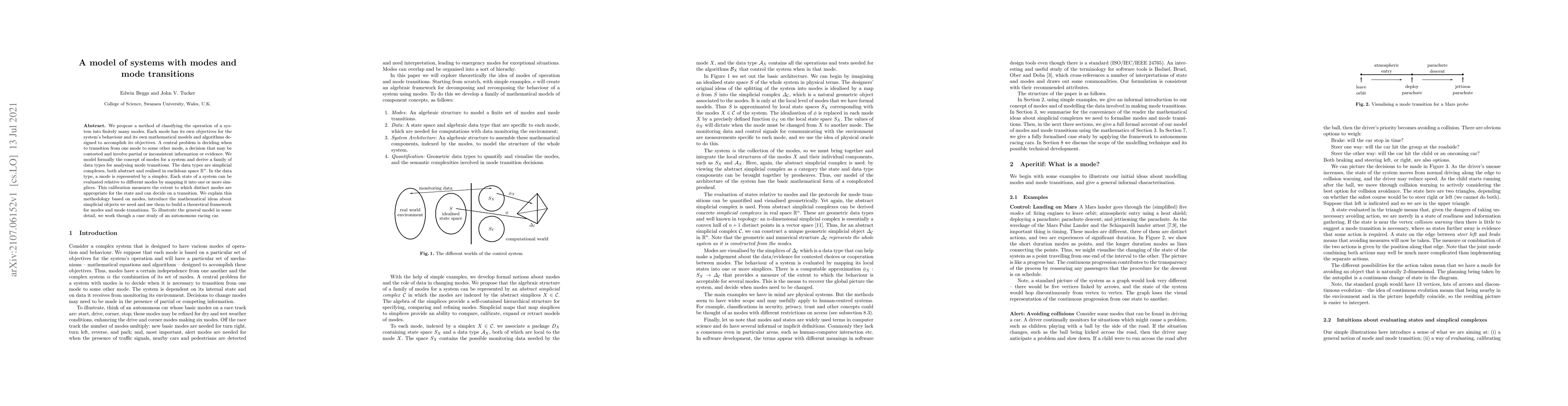 We propose a method of classifying the operation of a system into finitely many modes. Each mode has its own objectives for the system's behaviour and its own mathematical models and algorithms designed to accomplish its objectives. A central problem is deciding when to transition from one mode to some other mode, a decision that may be contested and involve partial or inconsistent information or evidence. We model formally the concept of modes for a system and derive a family of data types for analysing mode transitions. The data types are simplicial complexes, both abstract and realised in euclidean space $\mathbb{R}^{n}$. In the data type, a mode is represented by a simplex. Each state of a system can be evaluated relative to different modes by mapping it into one or more simplices. This calibration measures the extent to which distinct modes are appropriate for the state and can decide on a transition. We explain this methodology based on modes, introduce the mathematical ideas about simplicial objects we need and use them to build a theoretical framework for modes and mode transitions. To illustrate the general model in some detail, we work though a case study of an autonomous racing car.