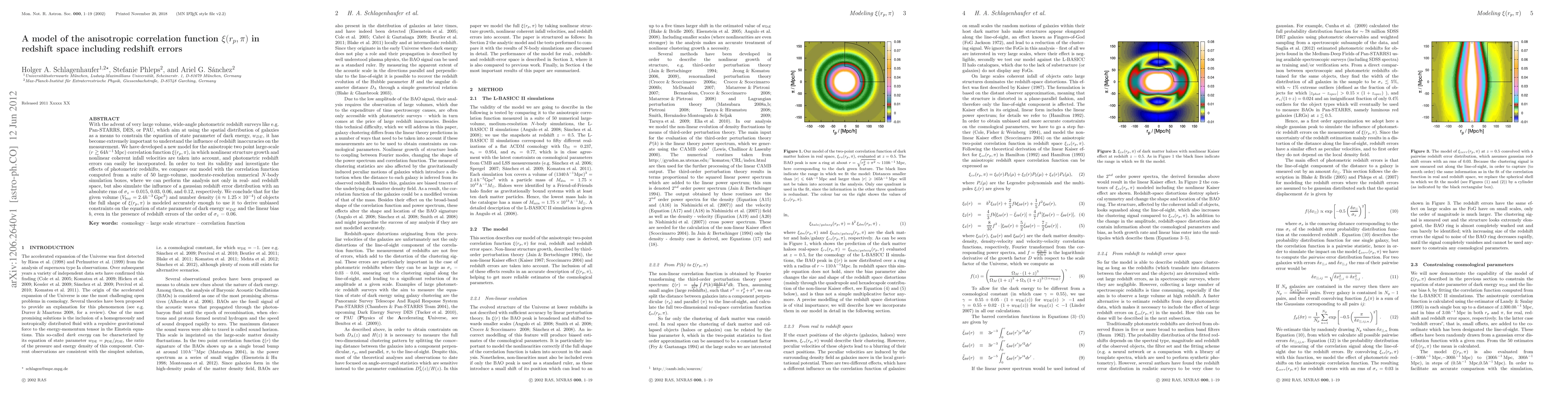 With the advent of very large volume, wide-angle photometric redshift surveys like e.g. Pan-STARRS, DES, or PAU, which aim at using the spatial distribution of galaxies as a means to constrain the equation of state parameter of dark energy, w_DE, it has become extremely important to understand the influence of redshift inaccuracies on the measurement. We have developed a new model for the anisotropic two point large-scale (r > 64 h^-1 Mpc) correlation function xi(rp,pi), in which nonlinear structure growth and nonlinear coherent infall velocities are taken into account, and photometric redshift errors can easily be incorporated. In order to test its validity and investigate the effects of photometric redshifts, we compare our model with the correlation function computed from a suite of 50 large-volume, moderate-resolution numerical N-body simulation boxes, where we can perform the analysis not only in real- and redshift space, but also simulate the influence of a gaussian redshift error distribution with an absolute rms of sigma_z= 0.015, 0.03, 0.06, and 0.12, respectively. We conclude that for the given volume (V_box =2.4 h^-3 Gpc^3) and number density (n ~ 1.25 10^-4) of objects the full shape of xi(rp,pi) is modeled accurately enough to use it to derive unbiased constraints on the equation of state parameter of dark energy w_DE and the linear bias b, even in the presence of redshift errors of the order of sigma_z = 0.06.